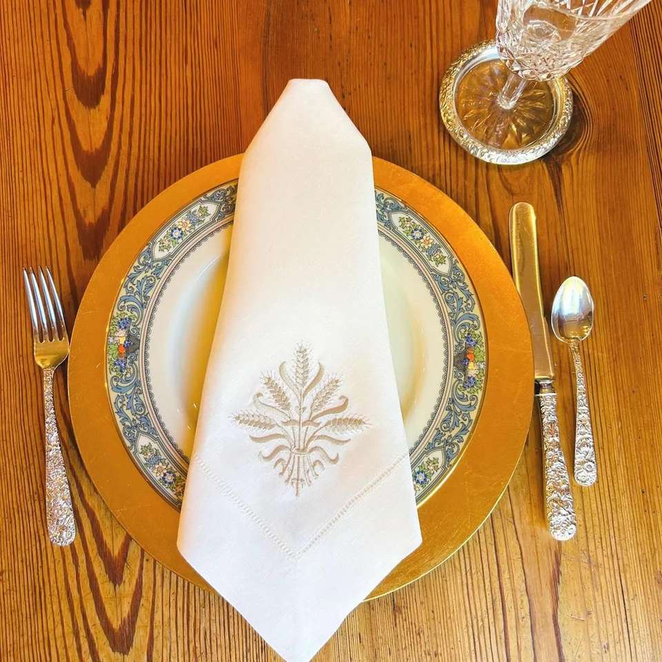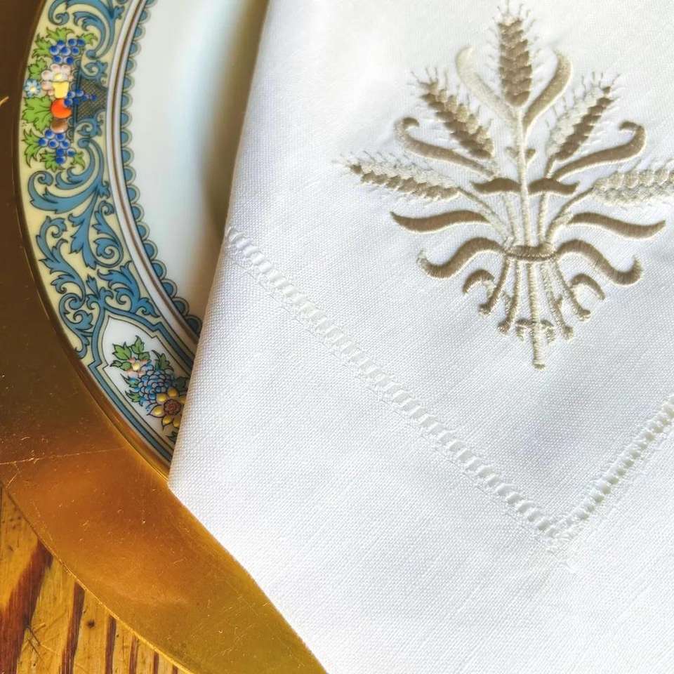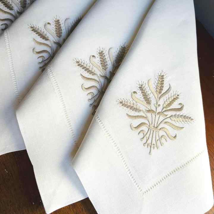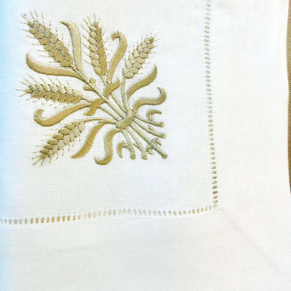 Tovaglioli e Tovaglie in Lino con Foglia d'Oro, Lavabili ed Ecologici, Moderni e Lussuosi, con Orlo a Punto Smirne, per Matrimoni