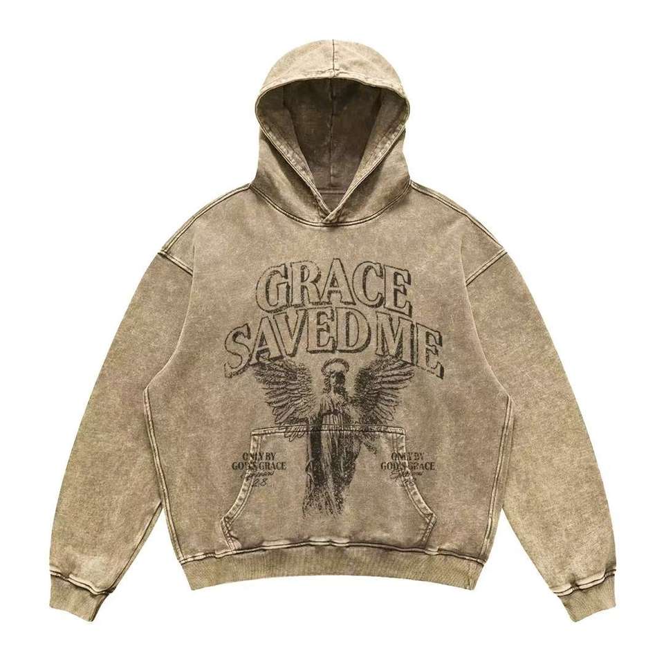 Felpa con cappuccio slavata Vintage Rock Print 100% cotone ampia lavorata a maglia autunnale con stampa digitale traspirante