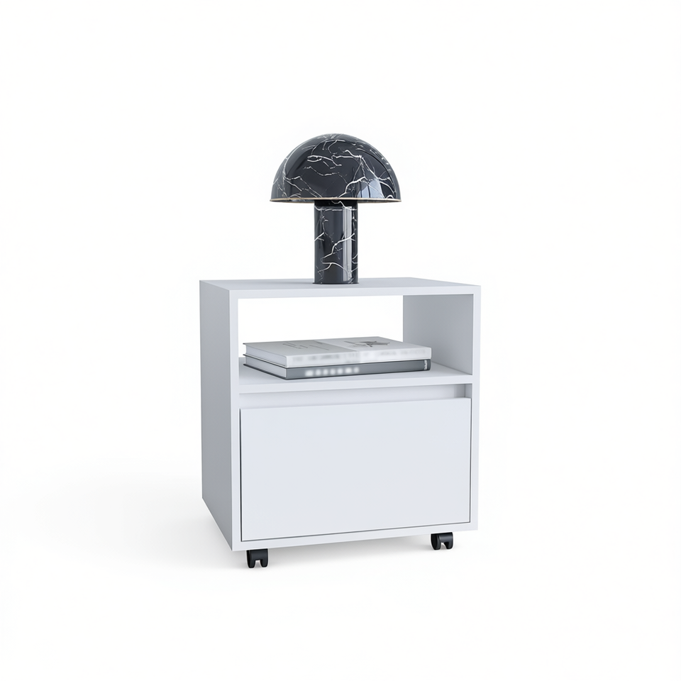 Comodino Bianco Wasilla con 1 Cassetto e Ripiano Aperto, Arredamento Moderno Minimalista per Camera da Letto con Rotelle