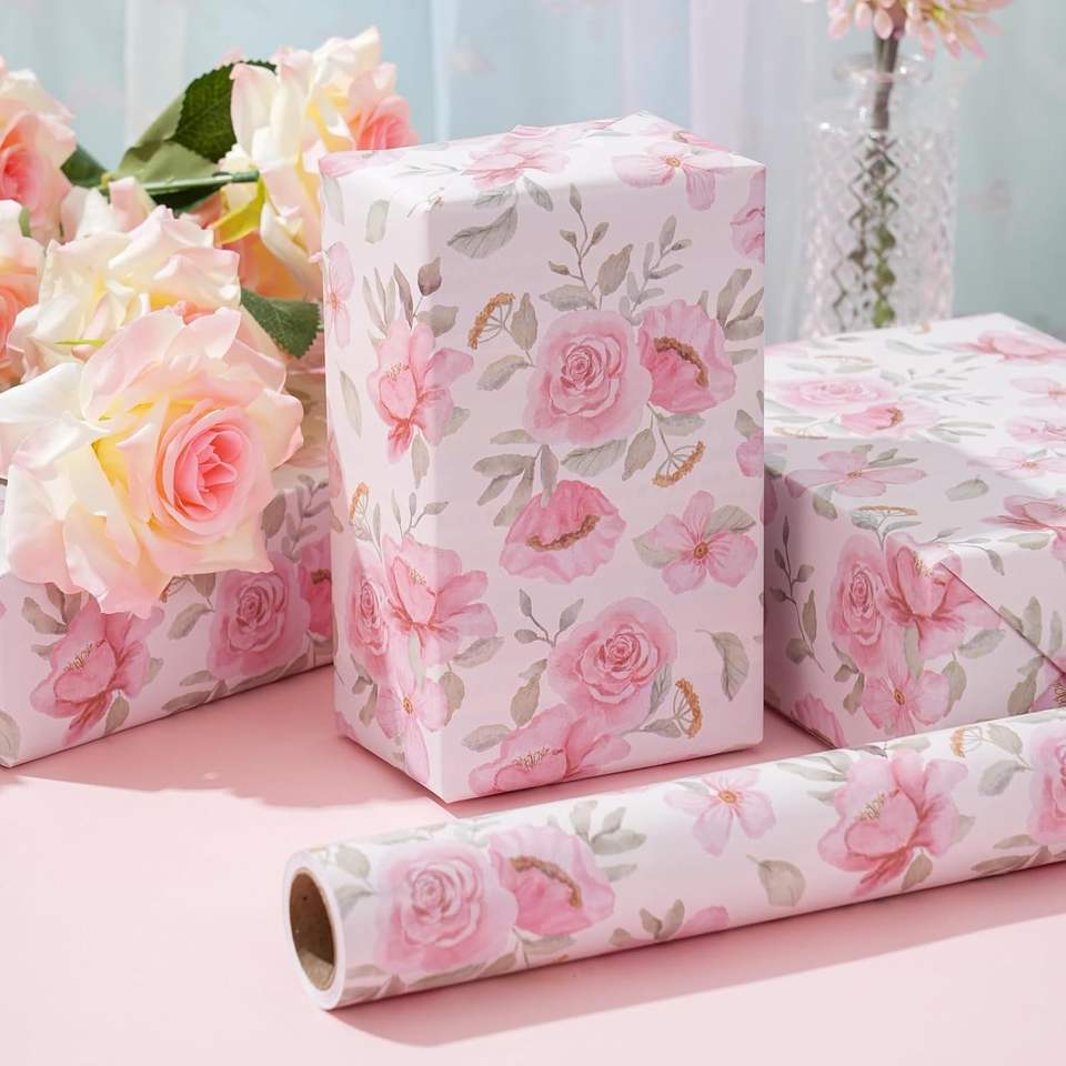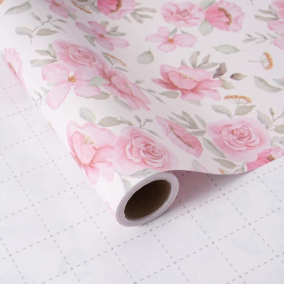 Rotolo di Carta da Regalo con Design di Foglie di Peonia ad Acquerello, 17 Pollici X 16,5 Piedi, Carta Floreale Rosa per Confezioni di Matrimoni e Addii al Nubilato
