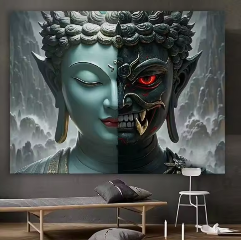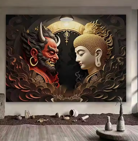 Murale Artistico Impermeabile in Stile Asiatico con Demoni e Buddha, Decorazione Personalizzata per Soggiorno e Camera da Letto