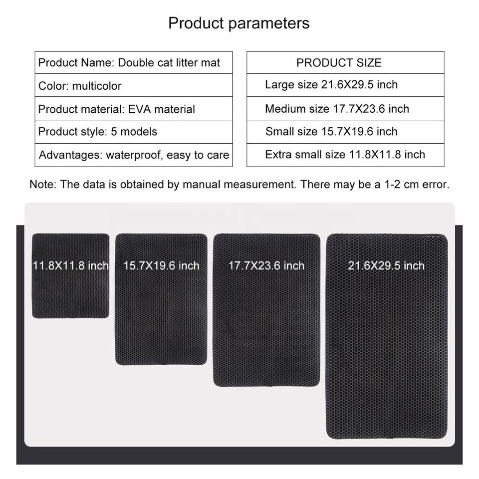 Package 1. Common Package: per piece in an OPP bag, and then in out carton. Shipping 1. Delivery Time: about 3 working days when we receive your payment for stock products. OEM order, we will list the delivery time in the quotation and sales contract. 2. Shipping Terms: By air, sea and express(DHL, FedEx, UPS and TNT) as your request. Waterproof non slip litter trap pad cat toilet sand mat double-layer black hole cat litter mat PVC material pet litter mat