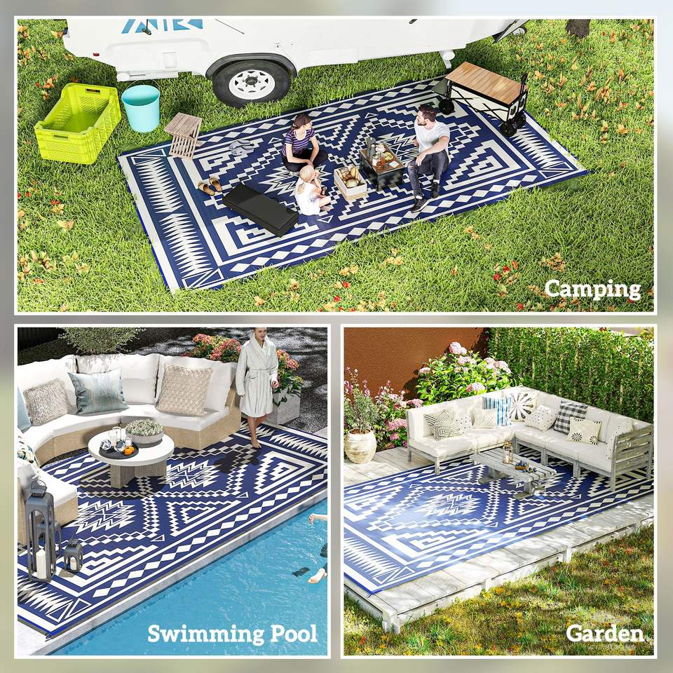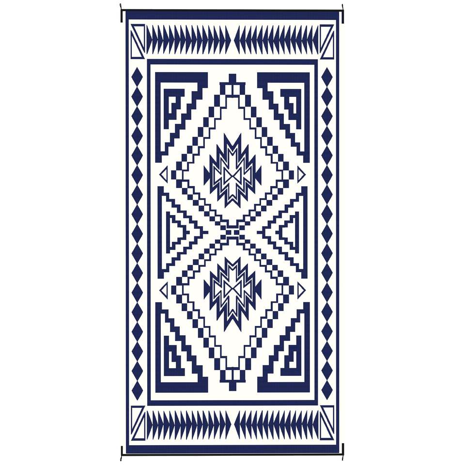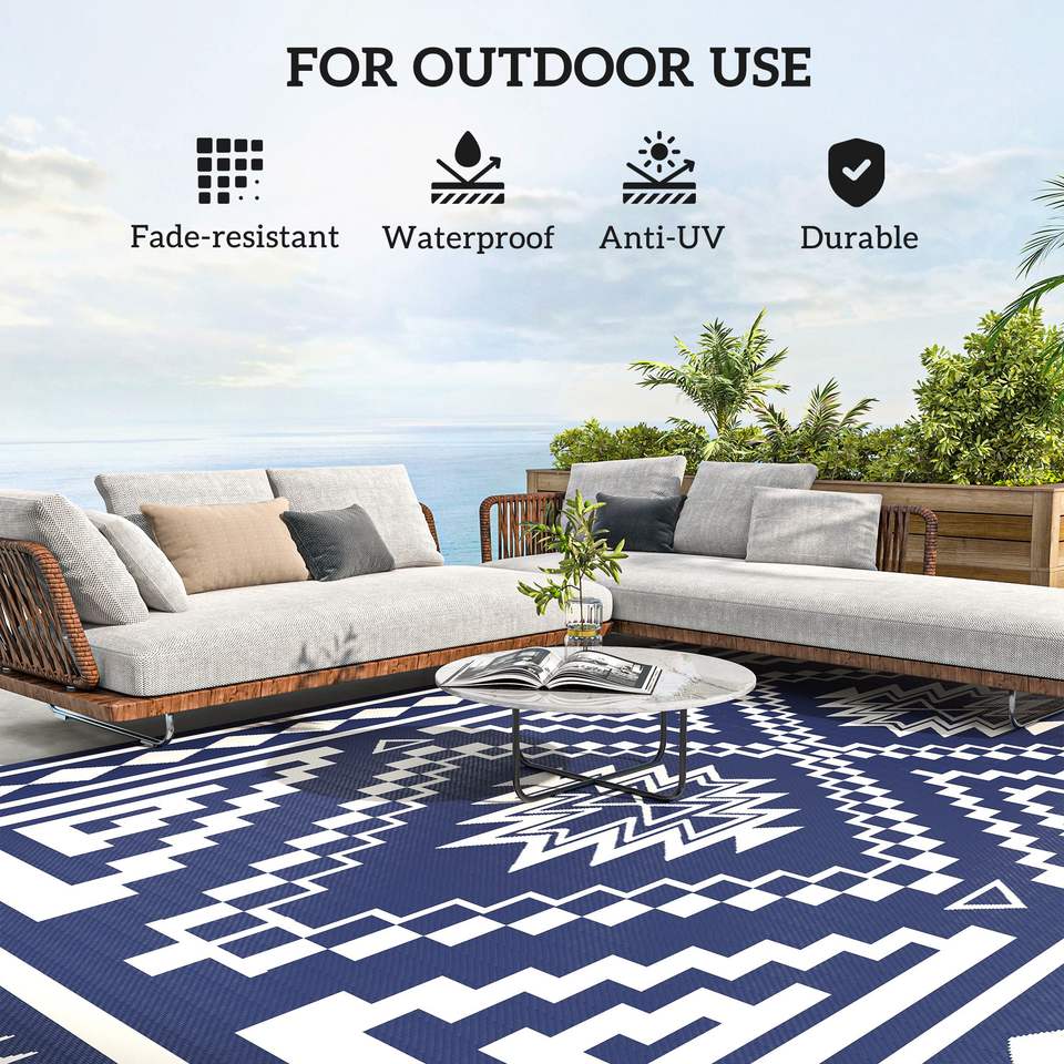 Waterproof Reversible Outdoor Rug 9' X 18' Blue & White Square Patchwork Carry Bag Included-Indoor/Outdoor Plastic Straw
