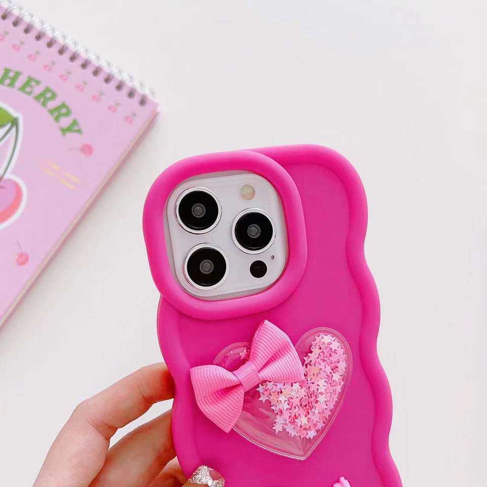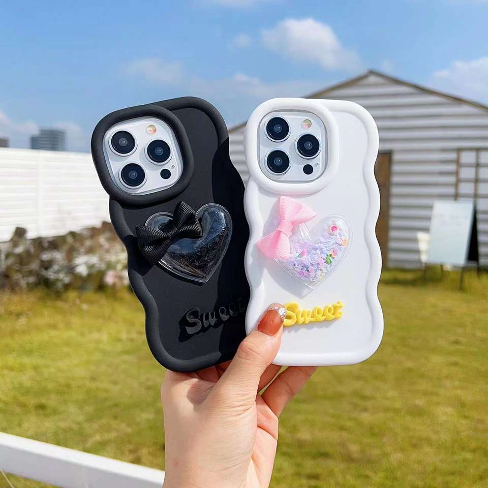 Cover ondulata per telefono con fiocco glitterato dolce amore cuore liquido decorazione 3D custodie per telefono personalizzate per iPhone 13 15 16 Pro Cover Max