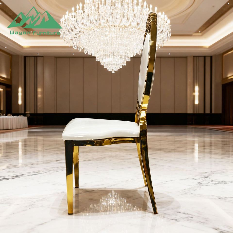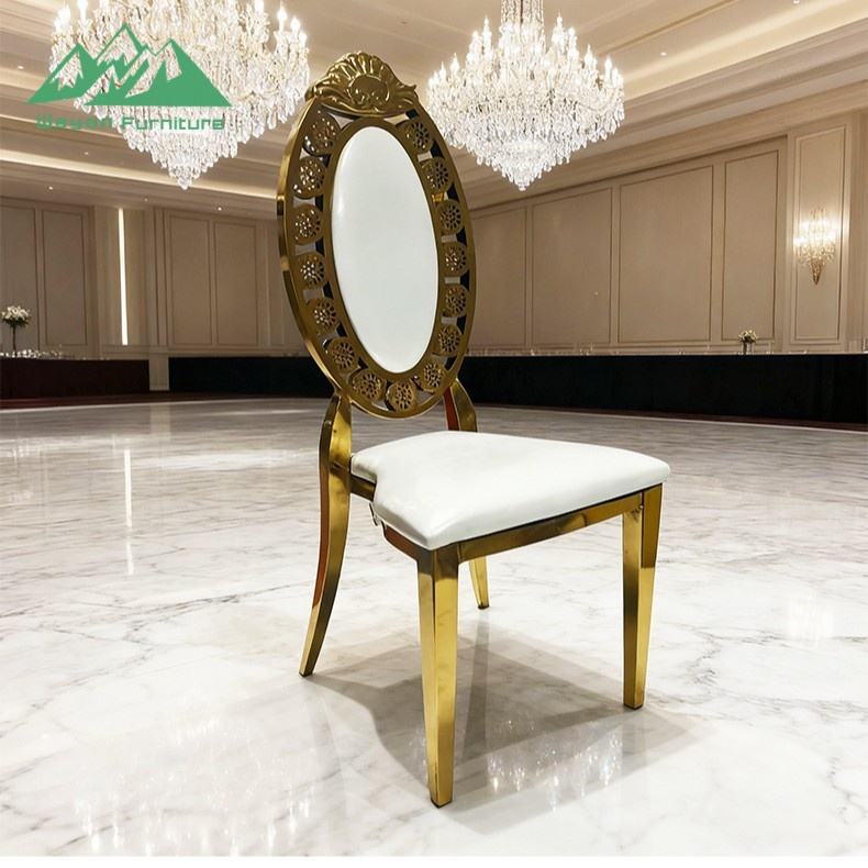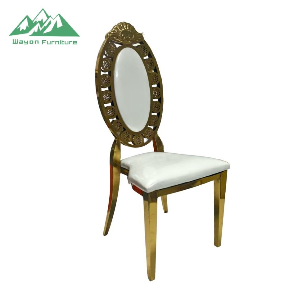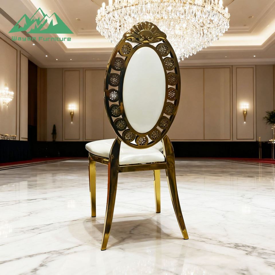 Sedia da banchetto di lusso Wayon in acciaio inossidabile dorato con schienale ovale e cuscino bianco, mobili per eventi e matrimoni