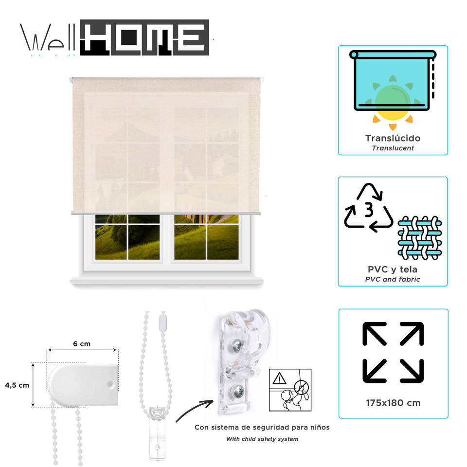 Tenda a Rullo Traslucida Well Home - Colore Lino, 180 x 175 cm (larghezza x lunghezza)/Dimensioni Tessuto 177 x 170 cm