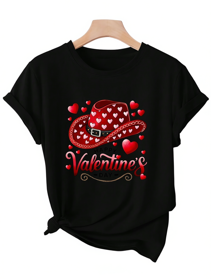 Western Women's Valentine's Day T-Shirt Short Sleeve Round Neck Heart Cowboy Hat Print Elegant Spring Summer Casual Fashion