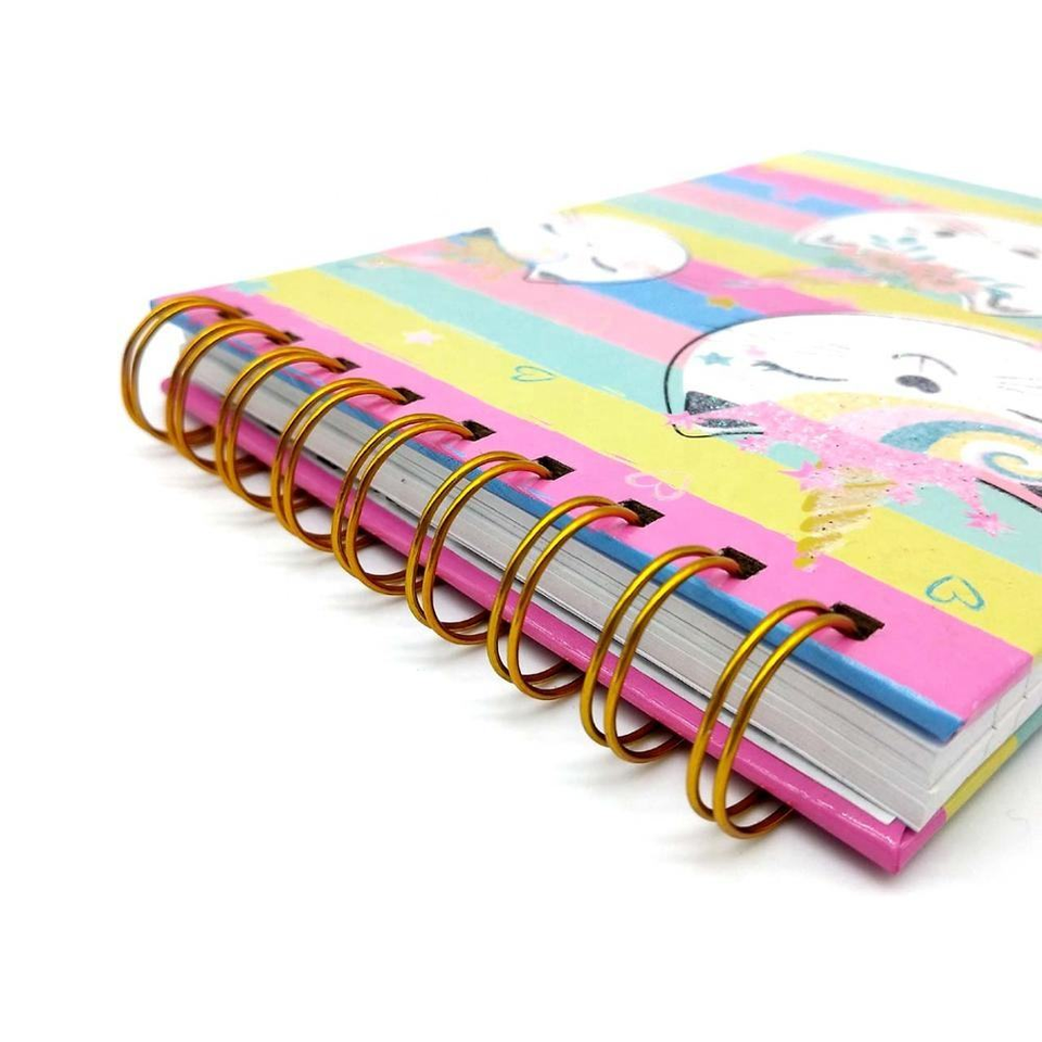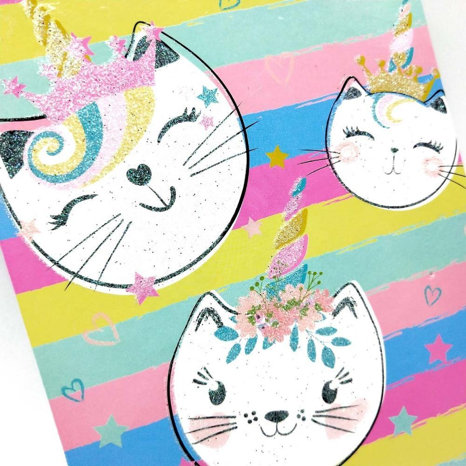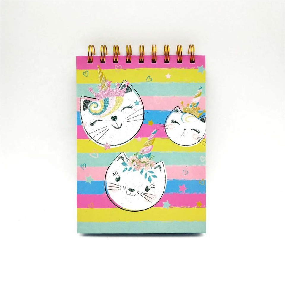 Quaderno a spirale Caticorn fantasia con sfondo a righe vivaci e illustrazioni di simpatici gatti-unicorni