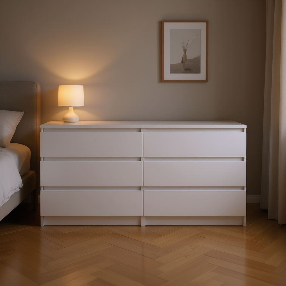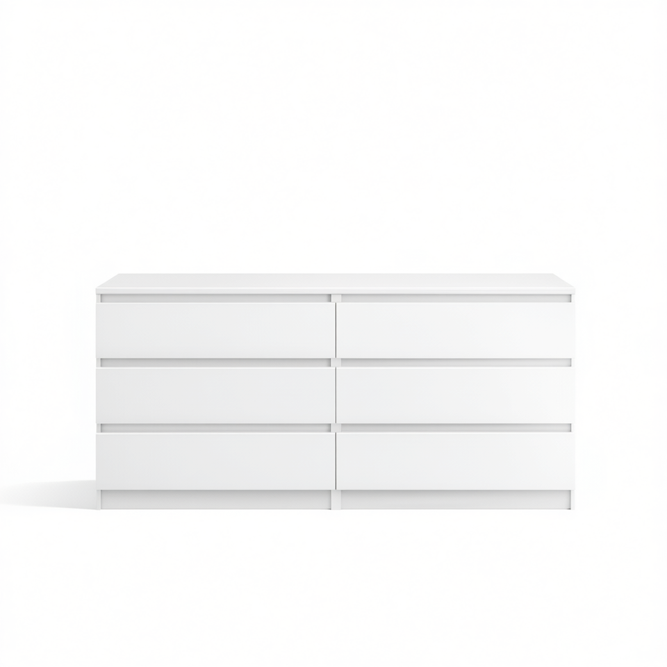 Comò Bianco a 6 Cassetti, Design Minimalista, Arredamento Camera da Letto, Costruzione in MDF con Pannelli in Legno