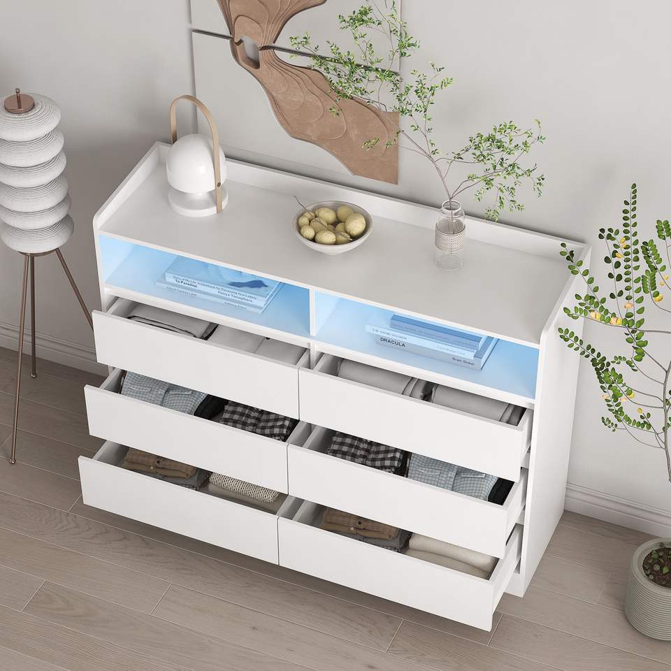 Comò bianco a 6 cassetti con luci a LED moderno robusto telaio per camera da letto ingresso o corridoio