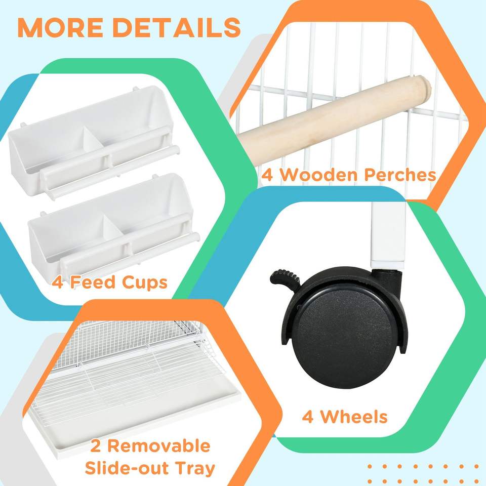 Gabbia per Uccelli in Metallo Bianco da 67 Pollici con Supporto su Ruote, Posatoi, Contenitori per Cibo e Porte, Accessori per Uccelli