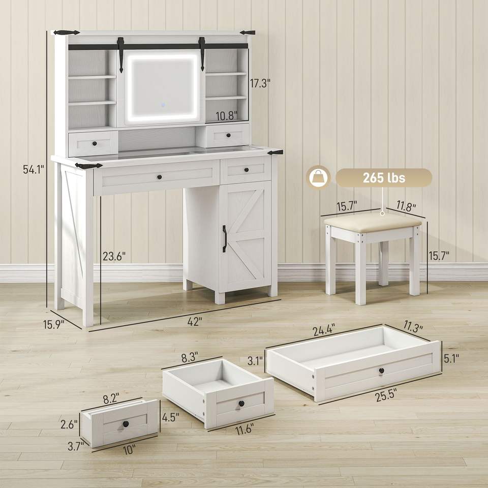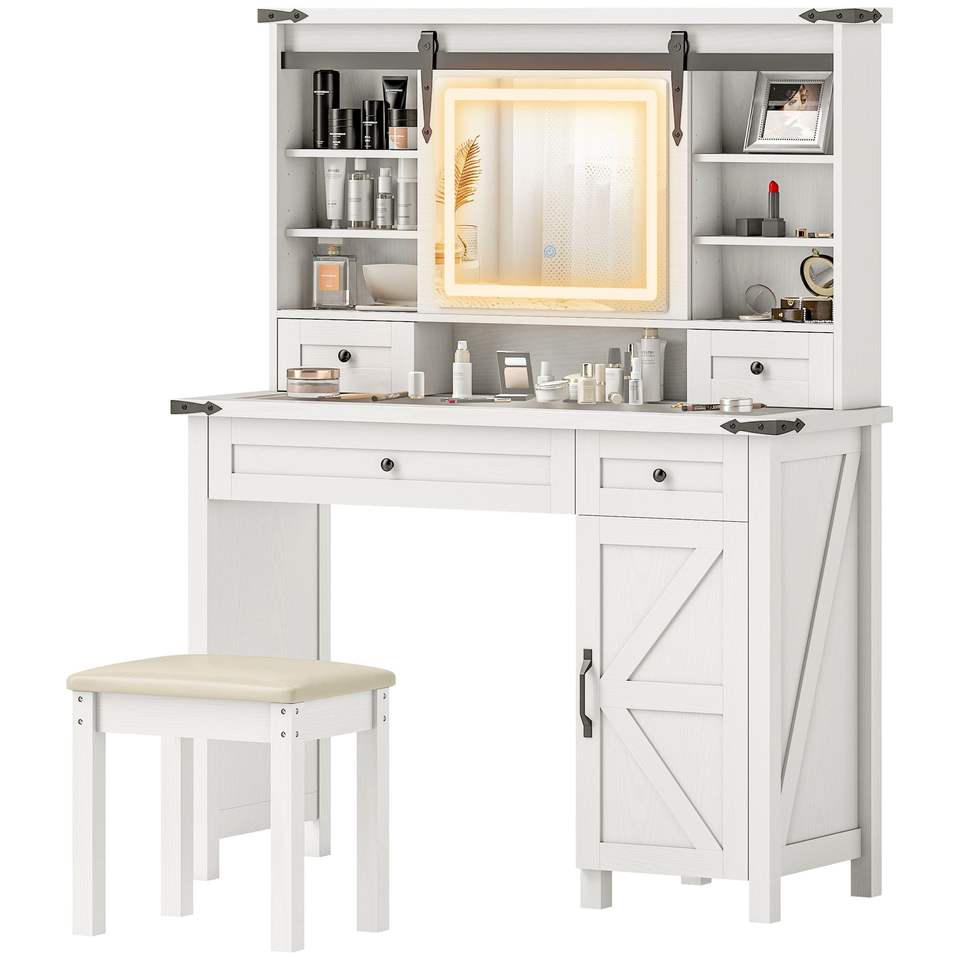 Set Toeletta Bianca per Camera da Letto con Specchio Illuminato, Sgabello Imbottito, Cassetti Contenitori e Mensole per il Trucco