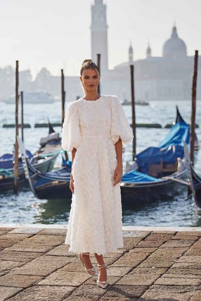 Abito tridimensionale con maniche a bolle bianche a forma di petali di rosa 2025 nuovo Design estivo, gonna lunga dolce ed elegante abbigliamento femminile