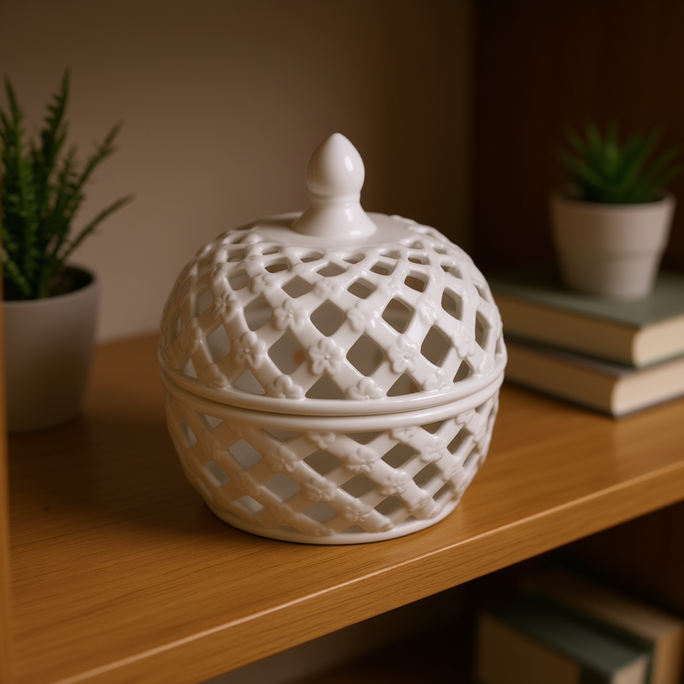 White Ceramic Lidded Jar D8x9.5 Lattice Design Decorative Storage Container for Living Room