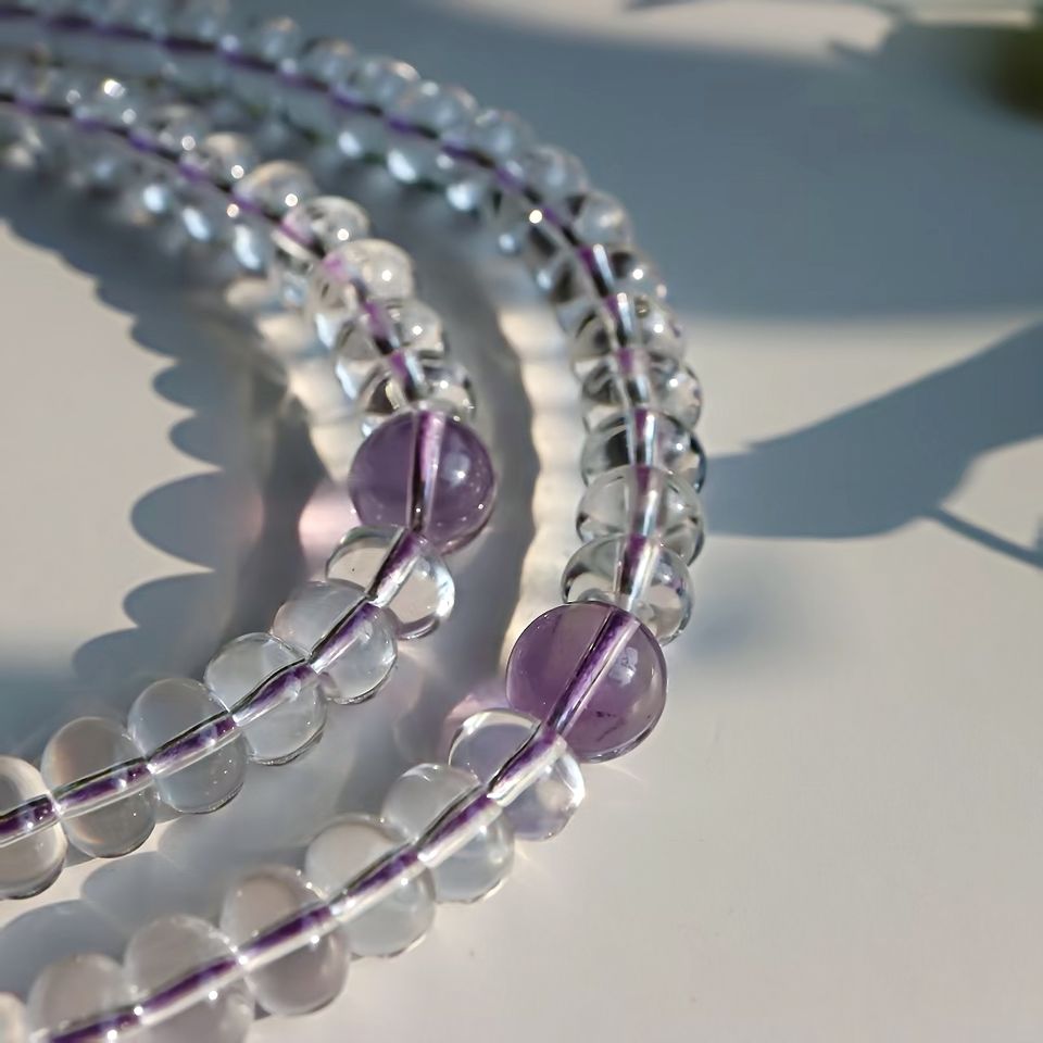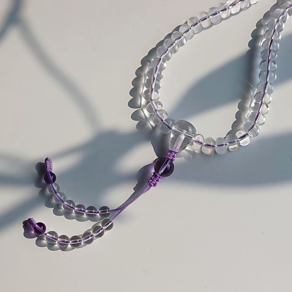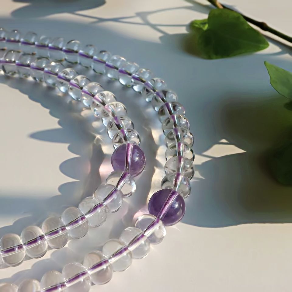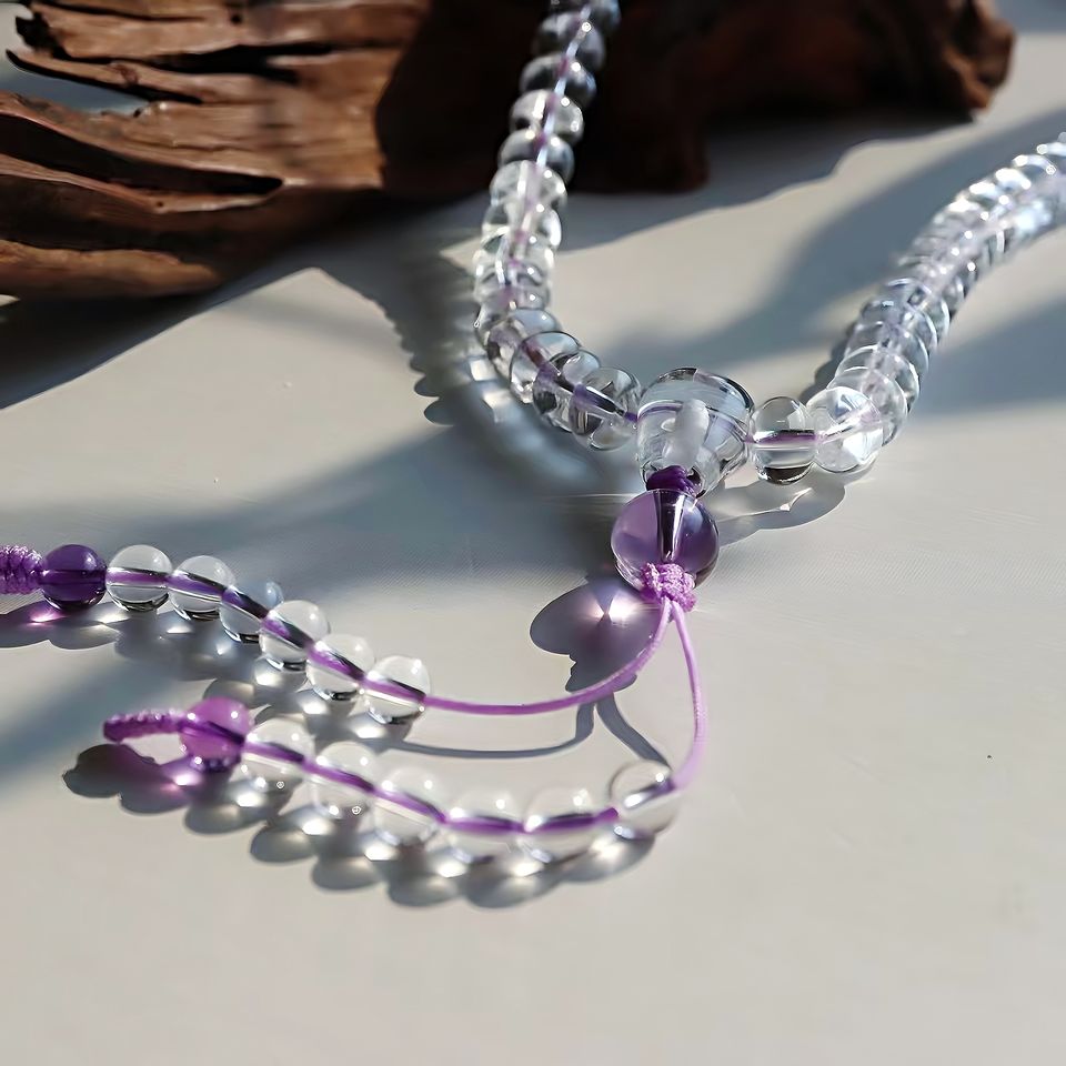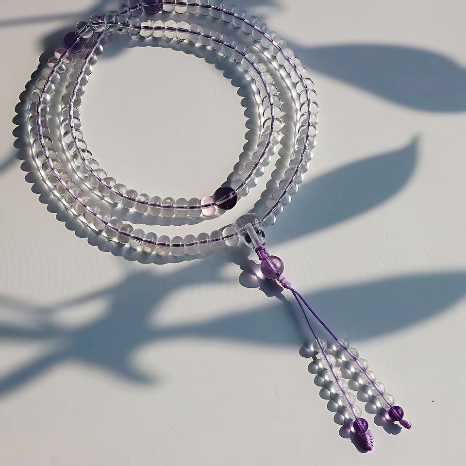 Mala di Perle di Cristallo Bianco, Rosario Buddista con 108 Perle di Ametista e Quarzo, Nappa Etnica e Spirituale