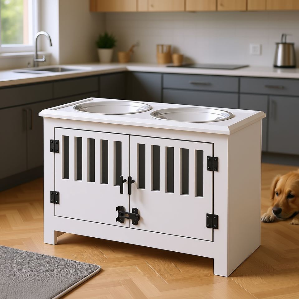 Mobiletto bianco per la conservazione del cibo per cani con ciotole, stazione di alimentazione per cani per Paws