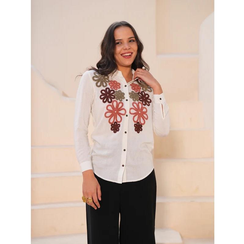 Top in Poliestere Bianco Ricamato con Maniche Lunghe e Colletto Aperto per Uscite Casual e Uso Quotidiano, Prezzo per Esportazione