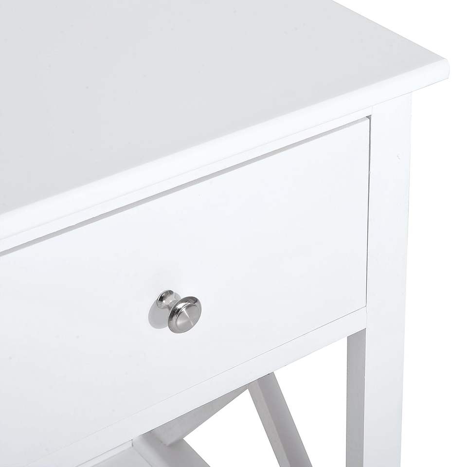 Comodino Bianco Stile Fattoria con Cassetto Portaoggetti, Ripiano Aperto e Struttura a X per Soggiorno o Tavolino Laterale