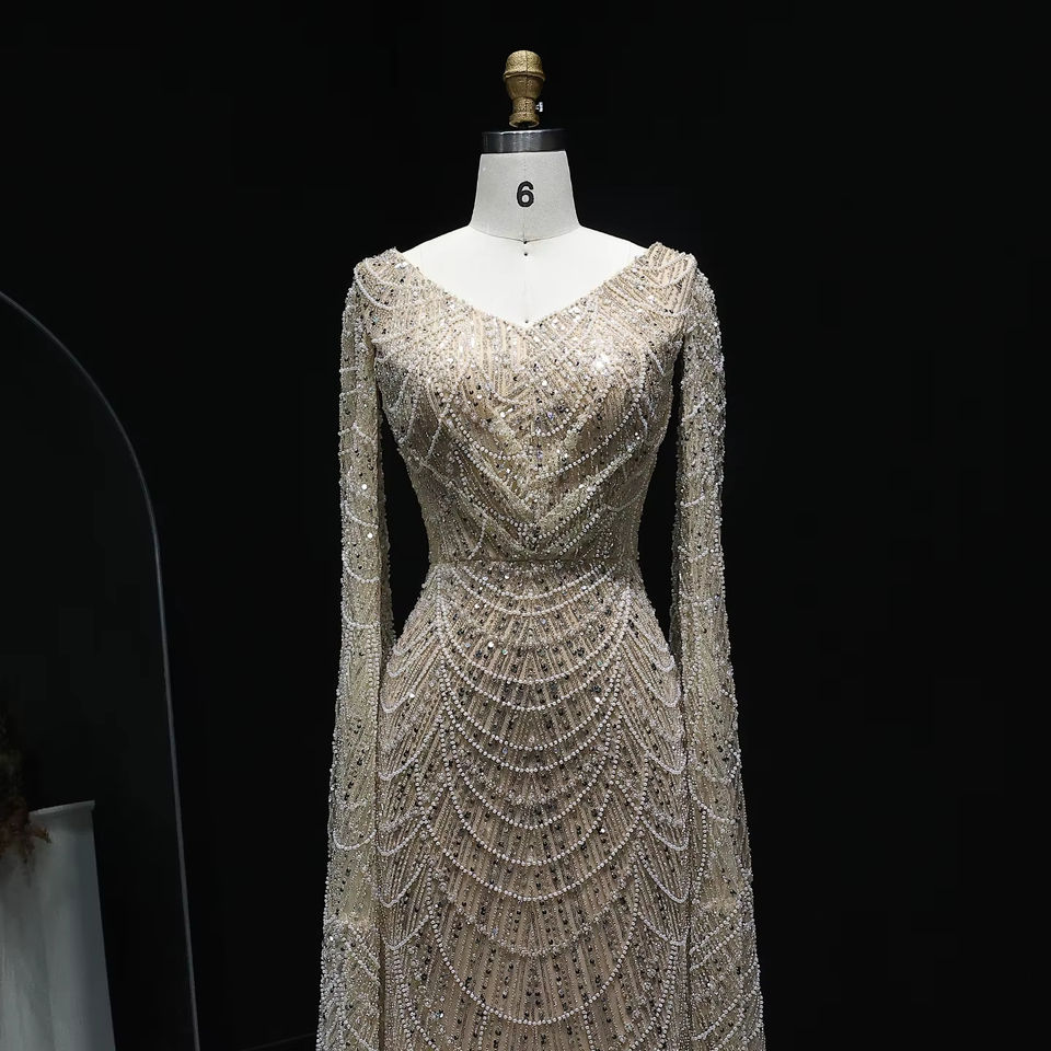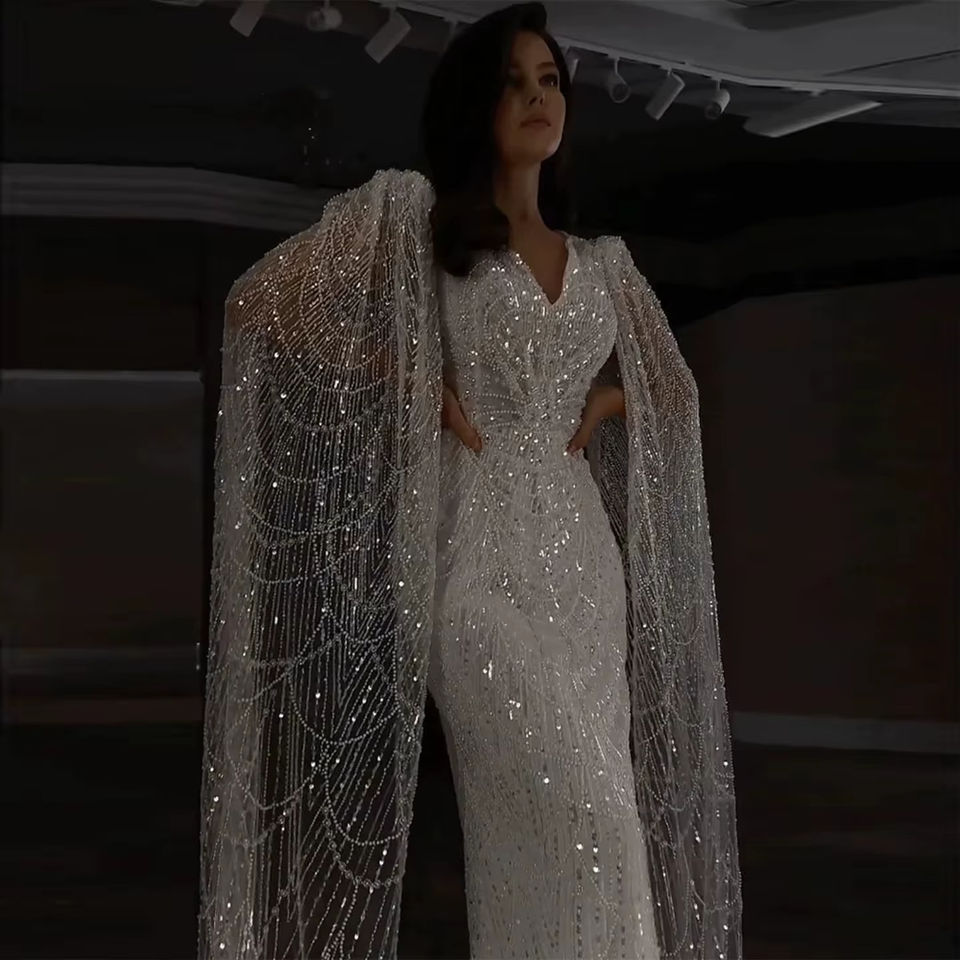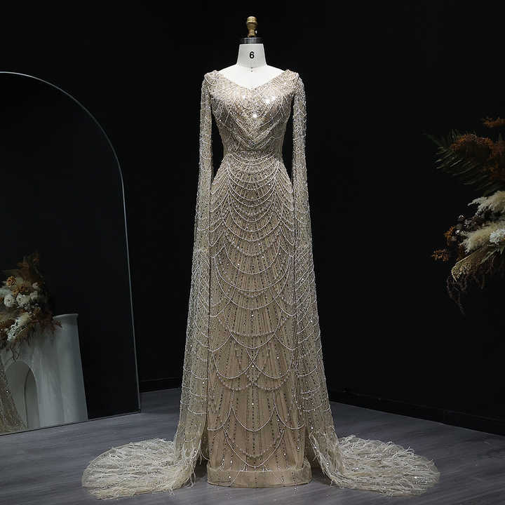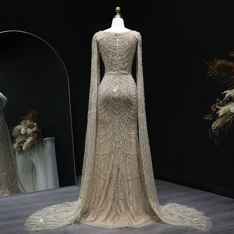 White Feather Luxury Mermaid Evening Dress with Cape Sleeves Dubai Arab Wedding Bridal Party Gowns LSZ110-1