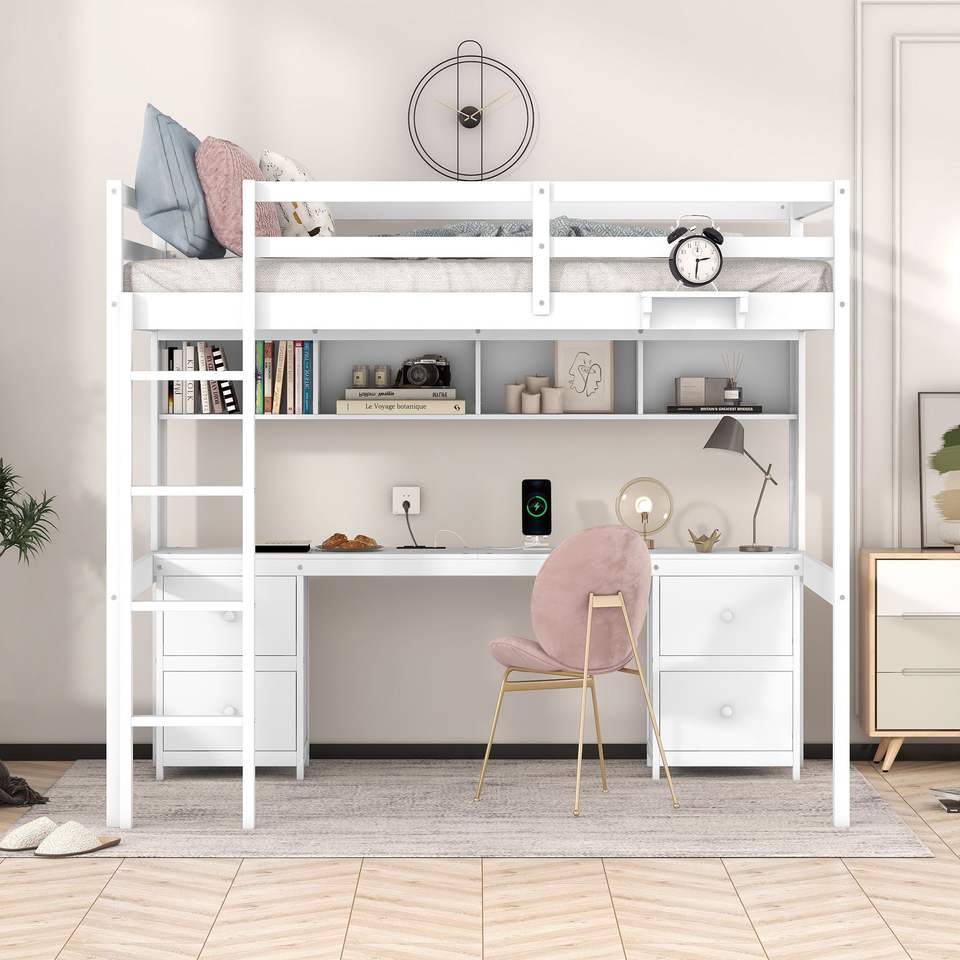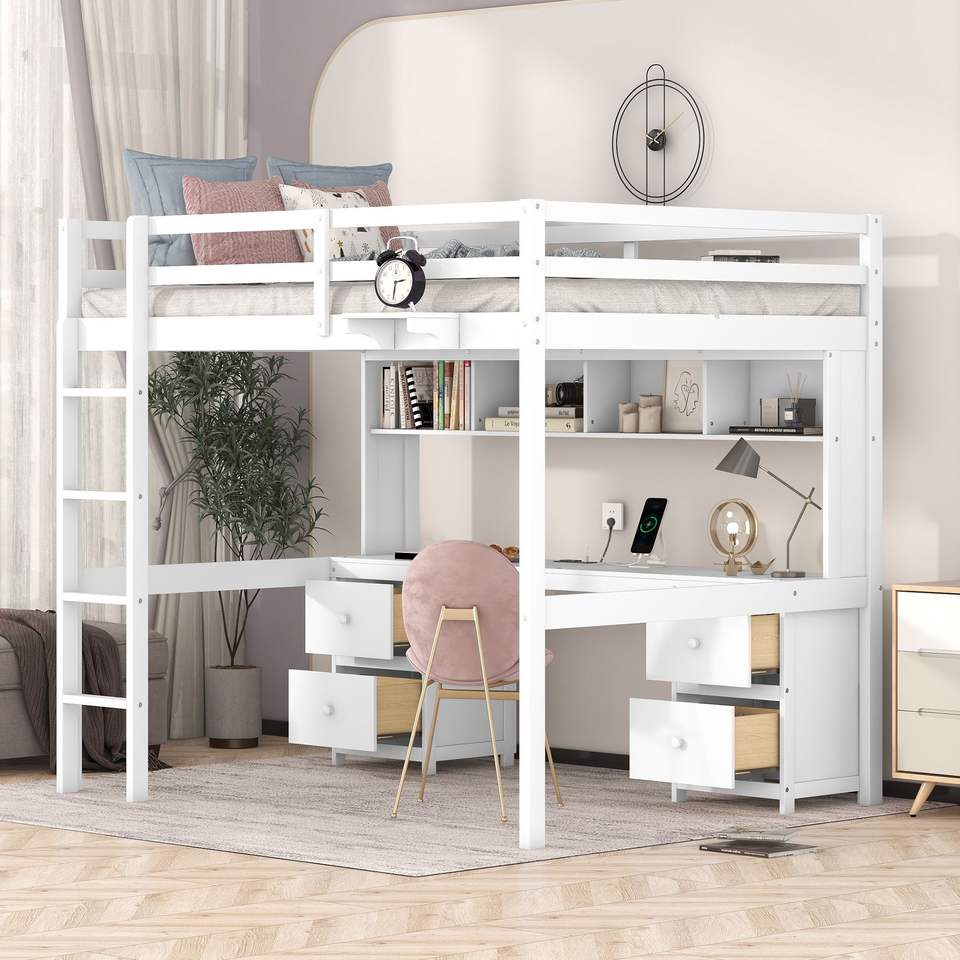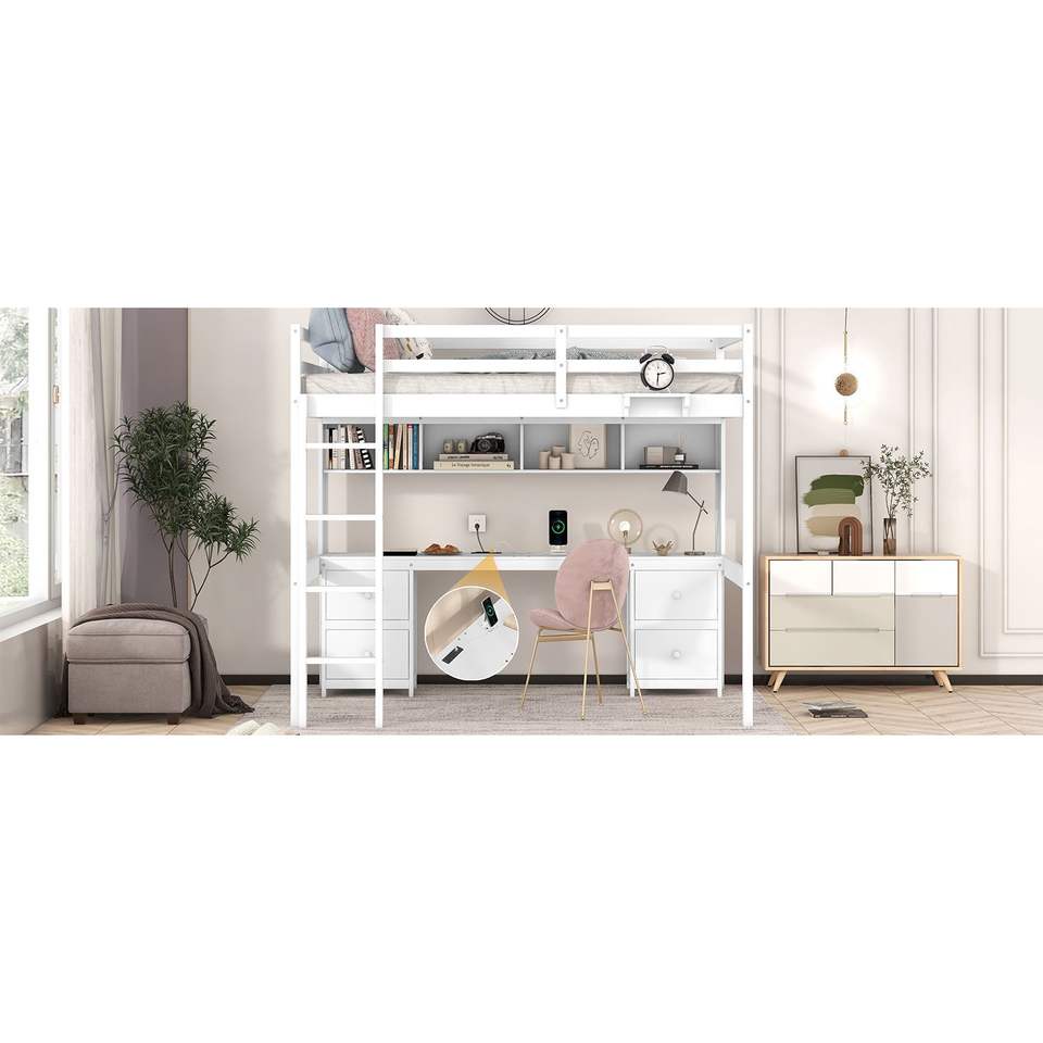Letto a soppalco bianco full-size con scrivania, armadietti, cassetti e vassoio comodino con stazione di ricarica