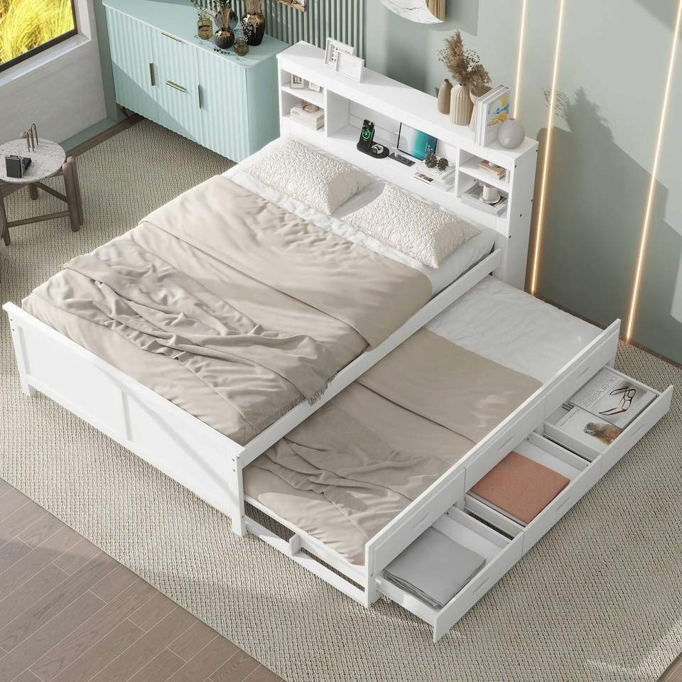 Letto matrimoniale bianco con piattaforma, testiera contenitore, porta USB, letto estraibile singolo e 3 cassetti, letto imbottito