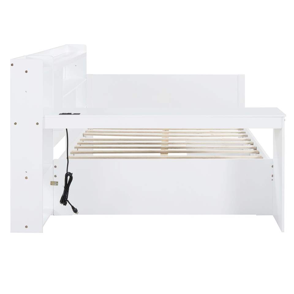 White Full-Size Wooden Daybed with 3 Drawers USB Ports Desk