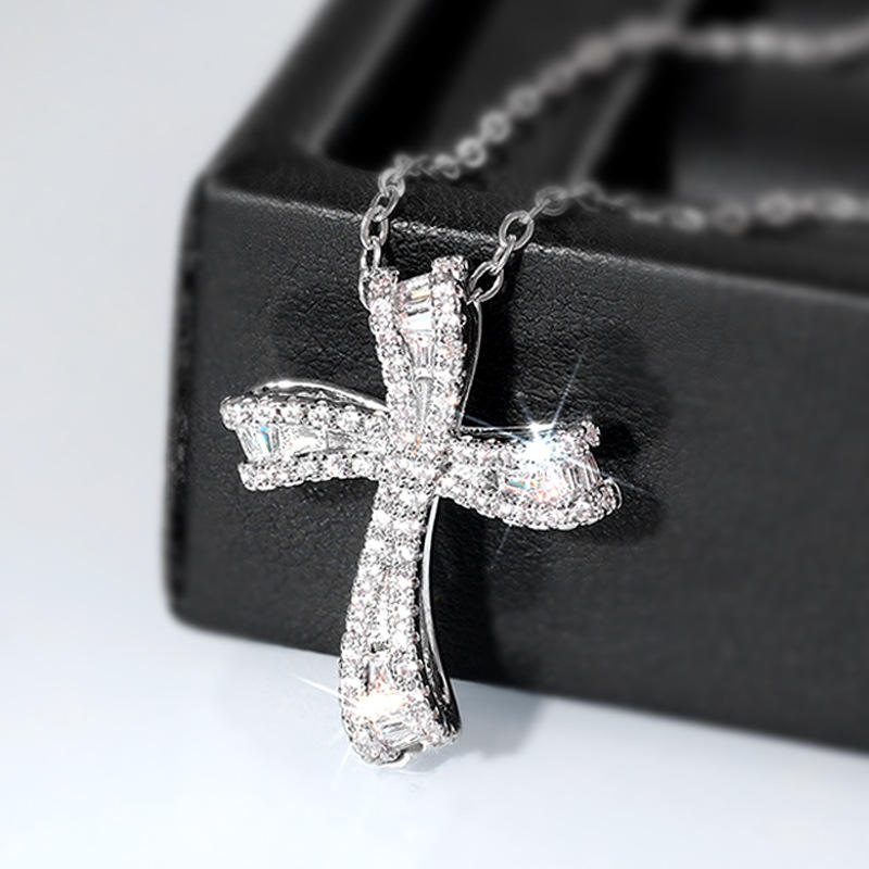Ciondolo a Croce in Oro Bianco con Cristalli e Strass, Gioiello Unisex Cristiano per Cerimonie Religiose