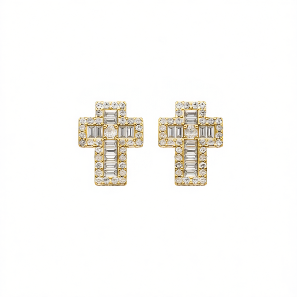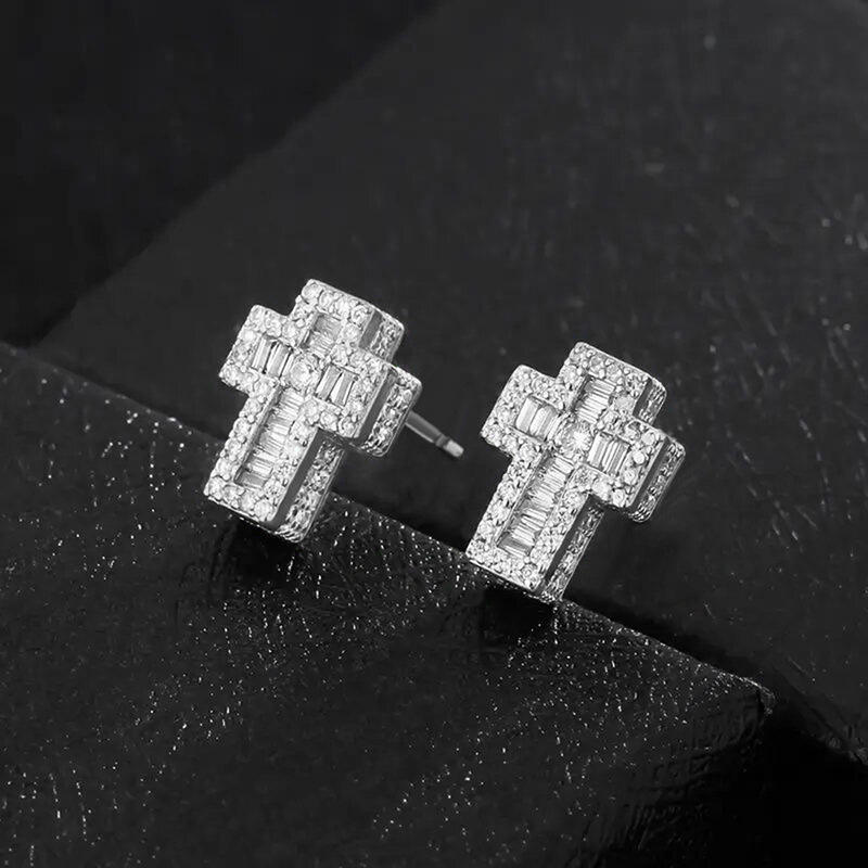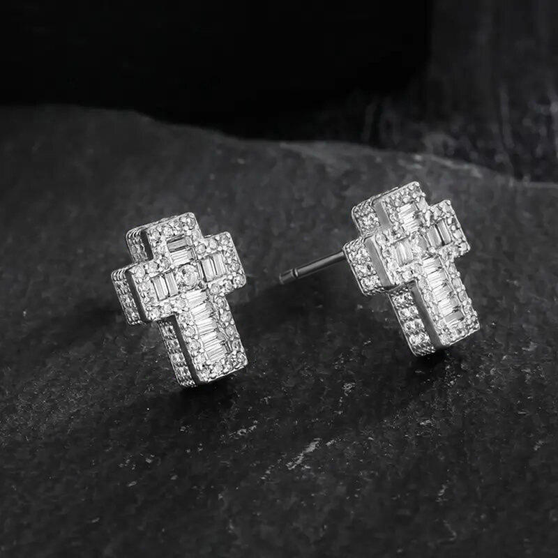 White Gold Cross Stud Earrings With Emerald Cut Crystal Rhinestones Channel Setting Religious Jewelry For Unisex Gift