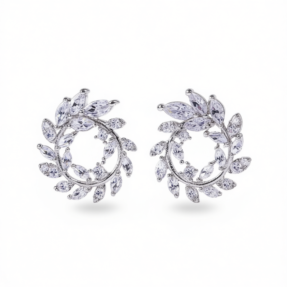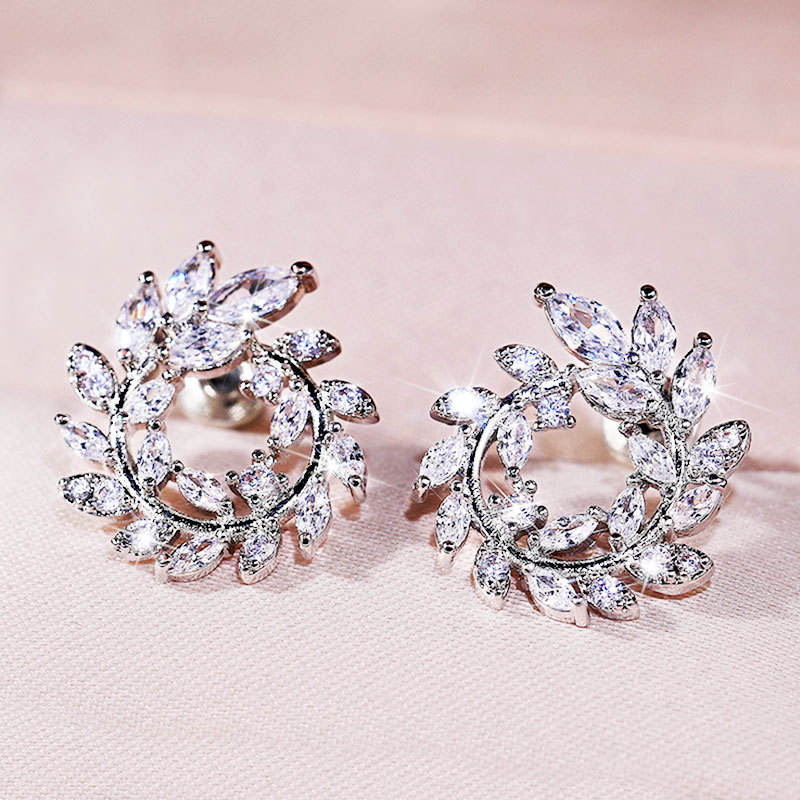 White Gold Crystal Stud Earrings 925 Silver Plant Shape Prong Setting Romantic Wedding Jewelry For Women