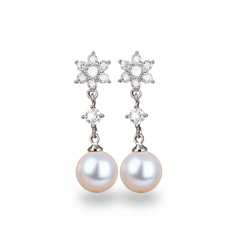 White Gold Flower Drop Earrings with Round Akoya AAA Pearl Claw Setting 925 Silver Rhodium Plated Classic Women Wedding Jewelry
