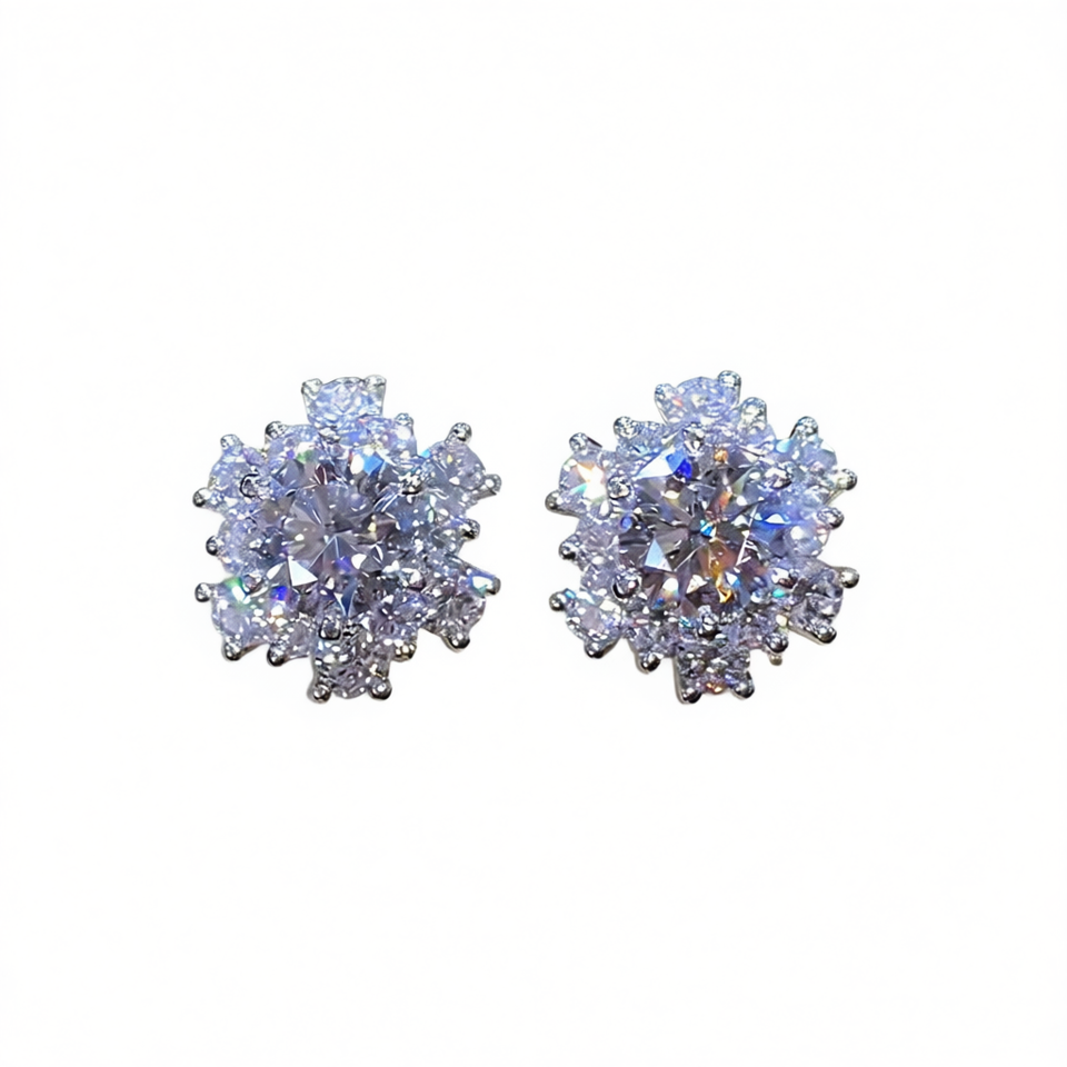 White Gold Flower Stud Earrings 925 Silver Crystal Rhinestone Claw Setting Classic Women's Everyday Wear