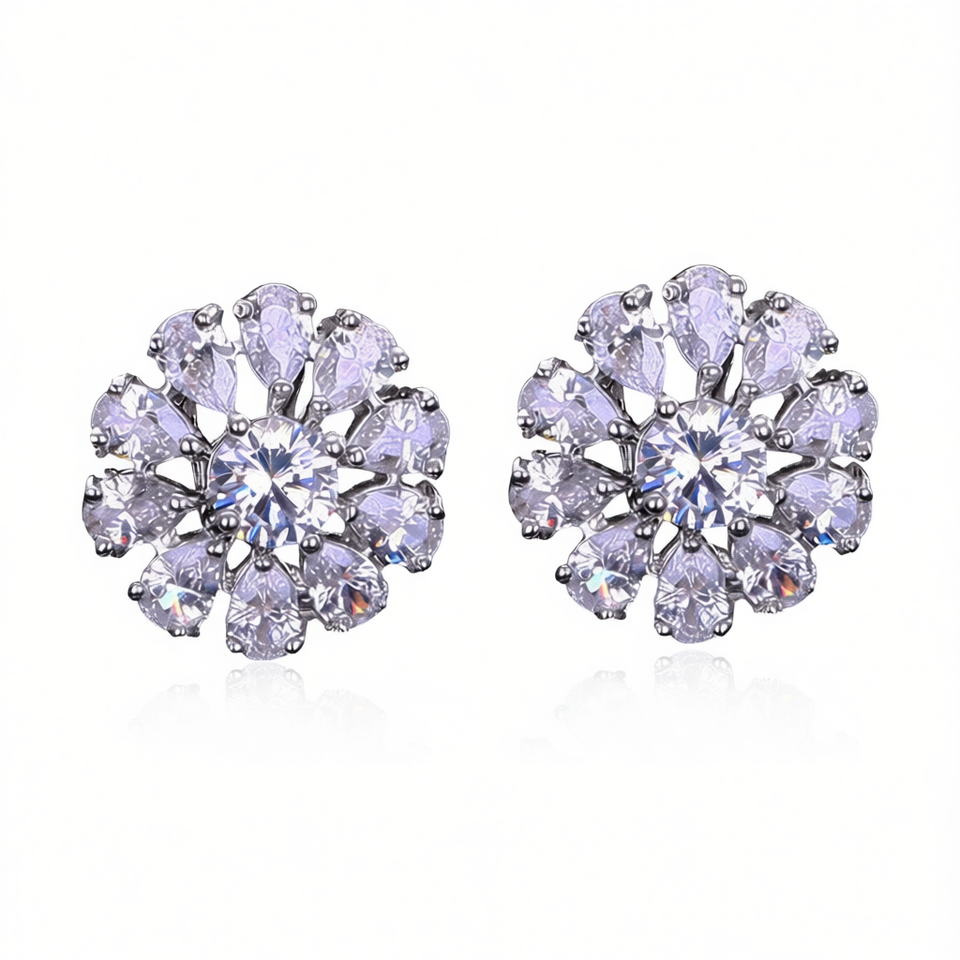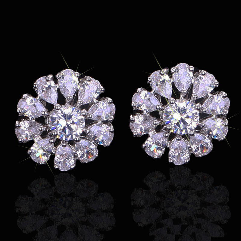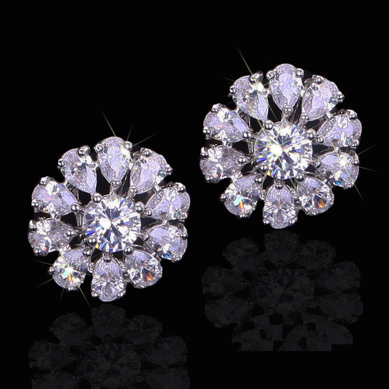 White Gold Flower Stud Earrings Crystal Rhinestone Round Brilliant Cut Claw Setting Women's Wedding Romantic Fashion Jewelry