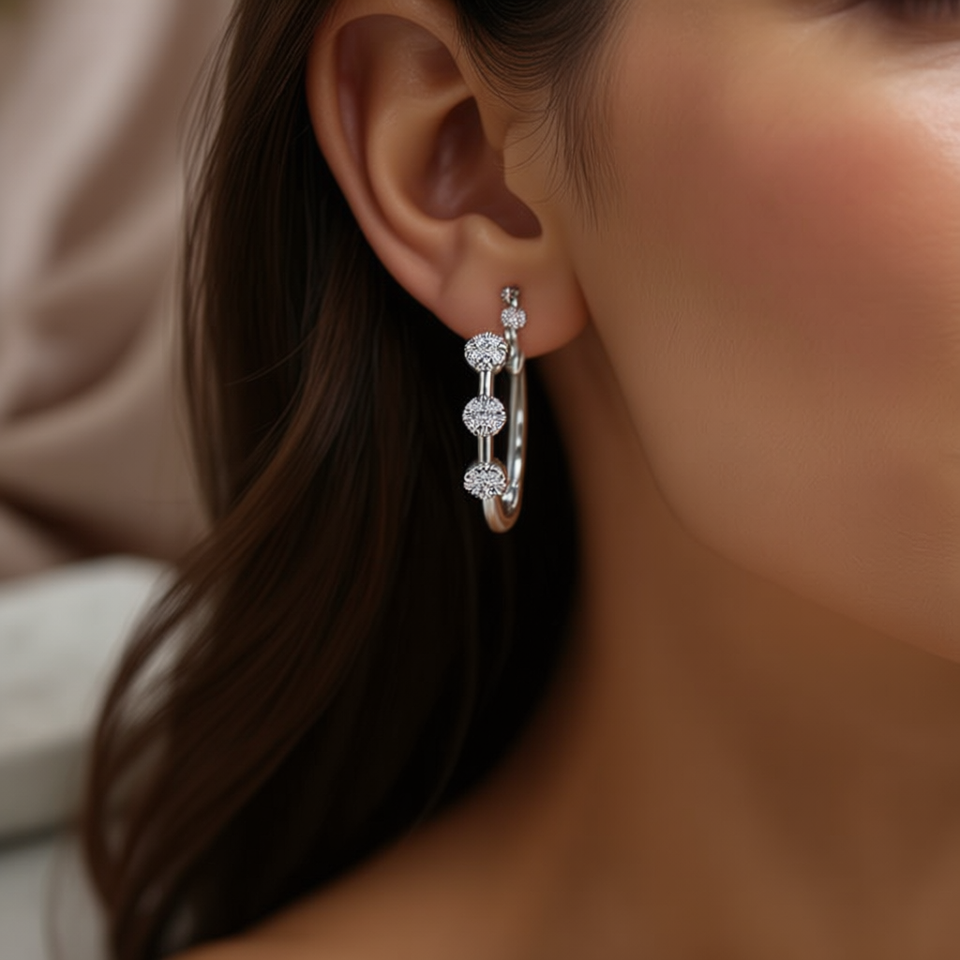Orecchini a Cerchio in Oro Bianco con Cristalli Rotondi Incastonati, Argento 925 Placcato Rodio, Stile Classico per Uso Quotidiano Femminile