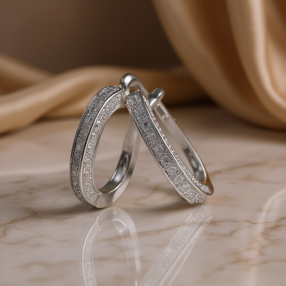 Orecchini a Cerchio in Oro Bianco con Diamanti Taglio Brillante Rotondo Incastonati a Canale, Stile Classico per Donne