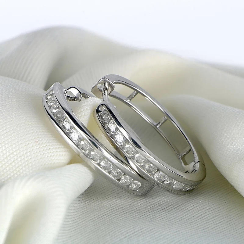 Orecchini a Cerchio in Oro Bianco con Cristalli Rotondi Incastonati a Canale per Donna, Stile Classico da Festa, Gioielli in Lega Placcata Rodio