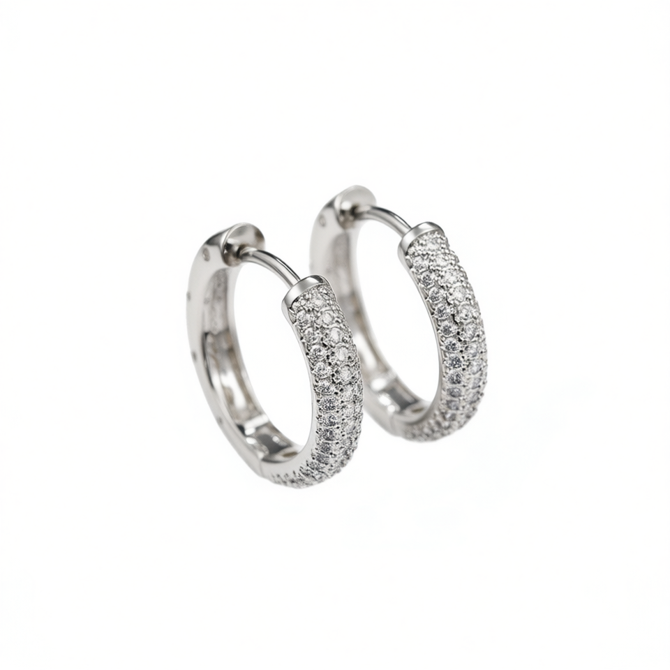 Orecchini a Cerchio in Oro Bianco con Cristalli Rotondi Taglio Brillante e Micro Inserti di Strass, Stile Classico per Gioielli da Festa per Donne