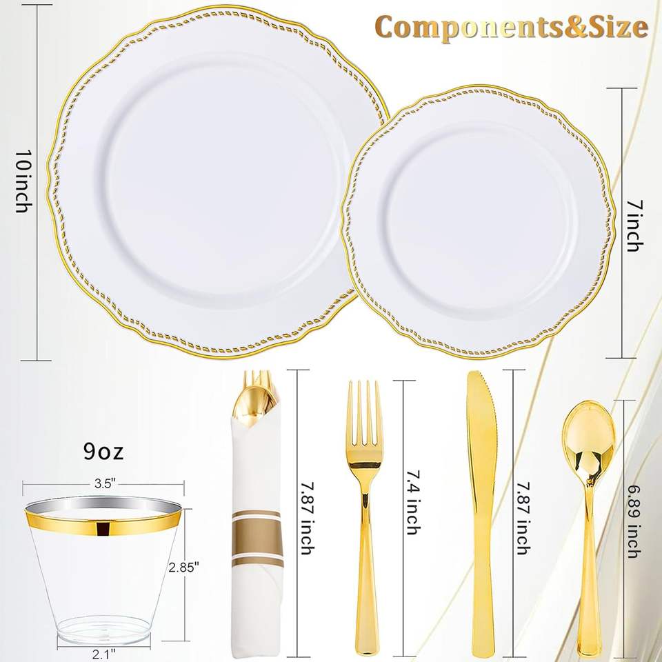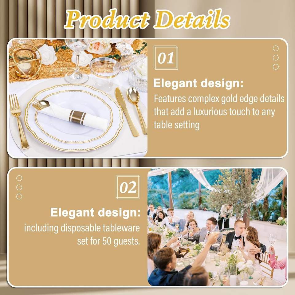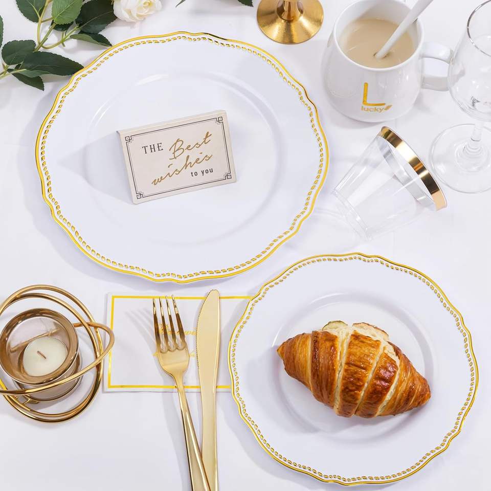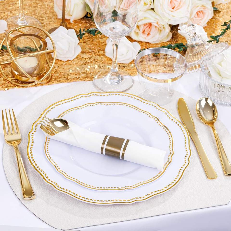 Set di Stoviglie in Plastica Bianca e Oro 350 Pezzi, Include 50 Piatti Fondi, 50 Piattini, 50 Bicchieri per Feste e Decorazioni da Tavola