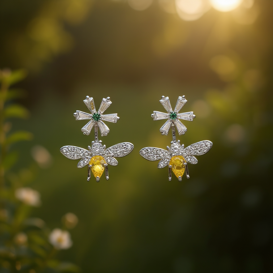 White Gold Plated Bee Stud Earrings With Pear Cut Zircon And Diamond Accents For Women Party Jewelry Cute Insect Design