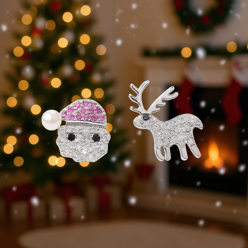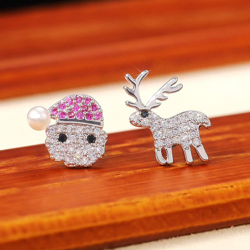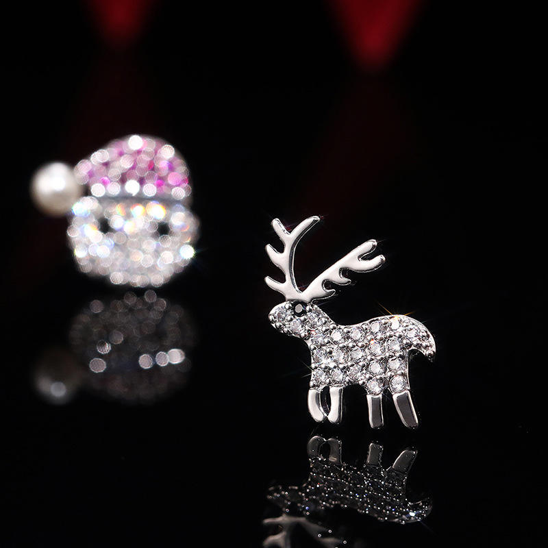 Orecchini a perno in oro bianco con Babbo Natale e renne, con micro inserti di strass in cristallo, gioielli da donna, regalo carino, argento 925