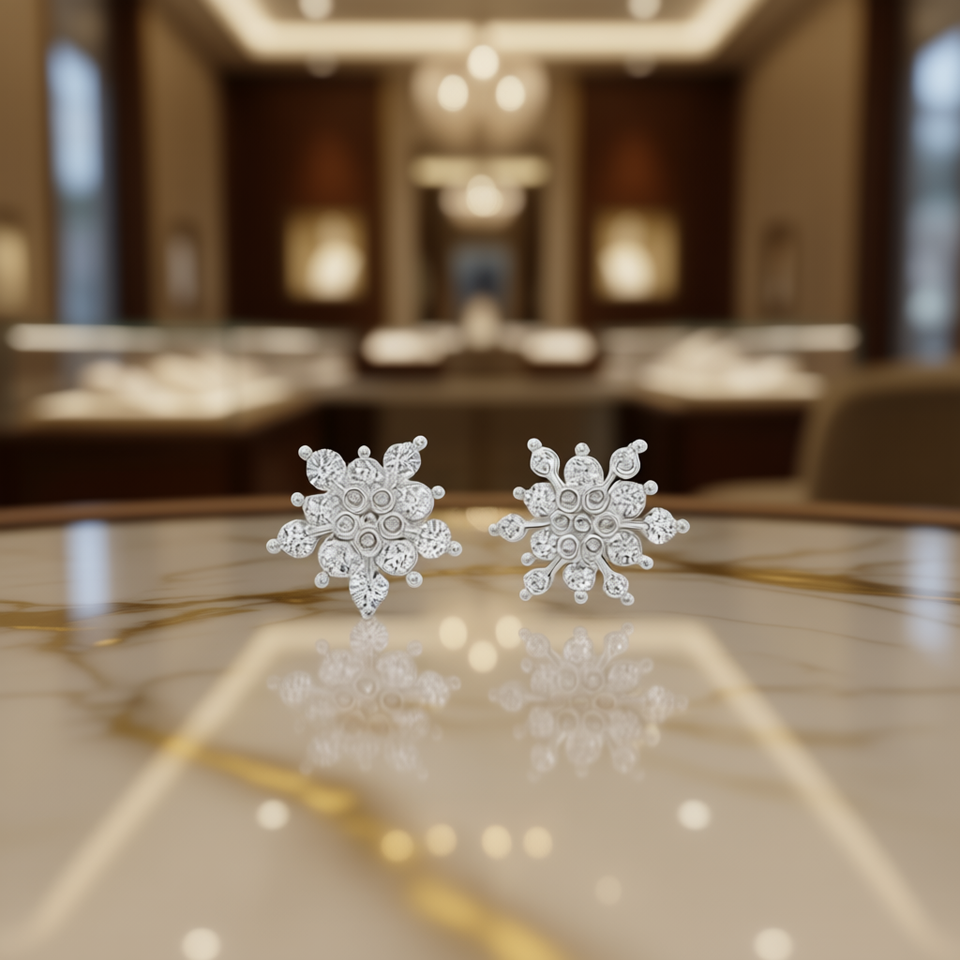 White Gold Snowflake Stud Earrings 925 Silver Crystal Rhinestone Round Brilliant Cut Prong Setting Classic Women's Everyday Wear