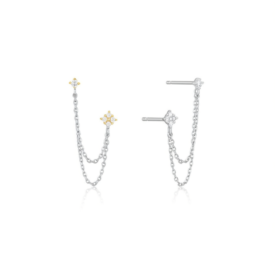 White Gold Star Stud Earrings With Diamond Chain 925 Silver Rhodium Plated Minimalist Design For Women Everyday Wear