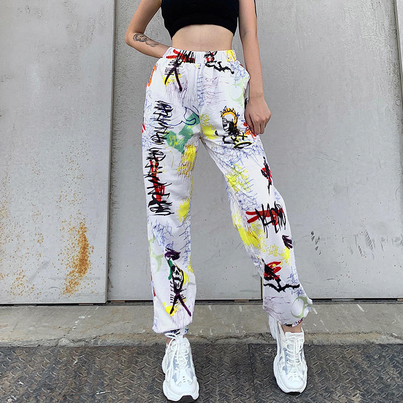 White Graffiti Baggy Cargo Pants Women Jogger Sweatpants Casual Pockets Elastic High Waist Trousers Female Hip Hop Streetwear