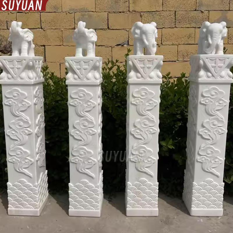 Colonna in Marmo Bianco con Scultura di Elefante e Cavallo, Decorazione Moderna Fatta a Mano Personalizzata con Nuvole Auspicanti per Casa, Cortile e Giardino
