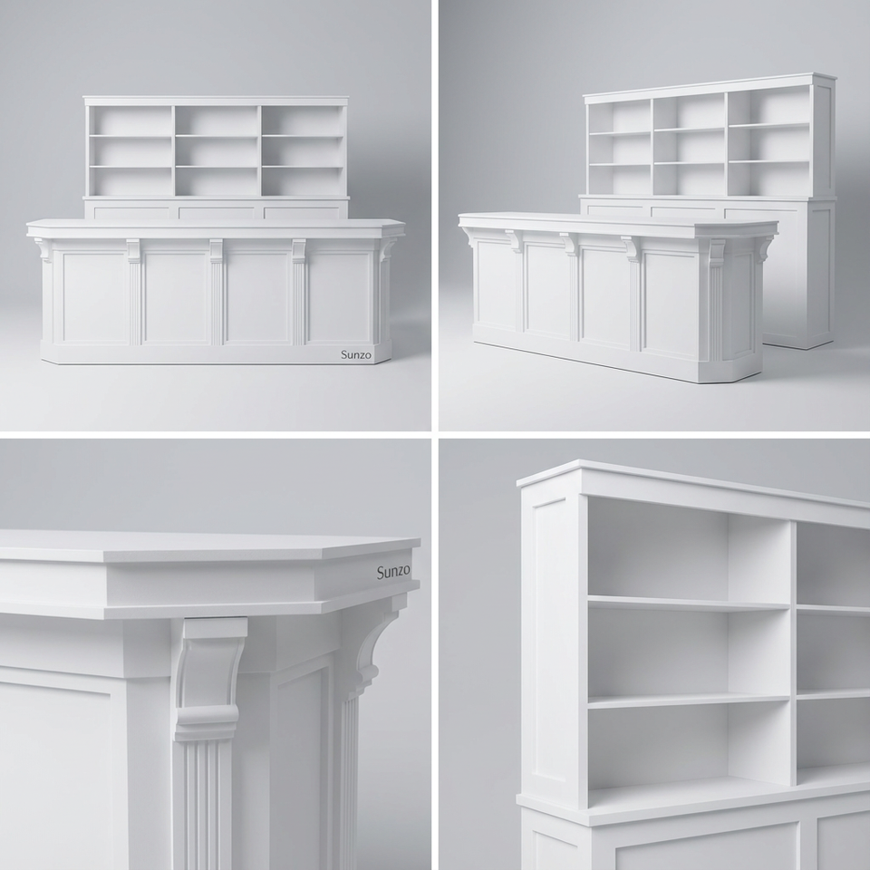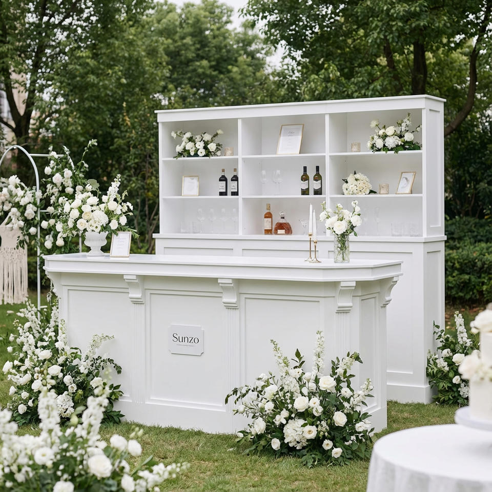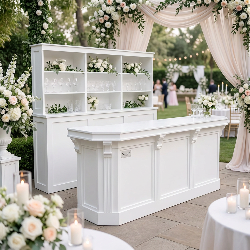 White Modern Assembled Plywood Wedding Bar Counter Set with Back Display Shelving for Farmhouse Outdoor Events