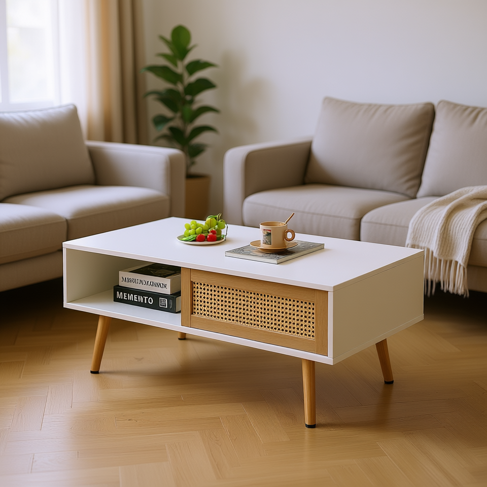 Tavolino da Caffè Moderno Bianco Naturale 41,34 Pollici con Porta Scorrevole, Gambe in Legno Massello, Design in Rattan, Arredamento per Soggiorno
