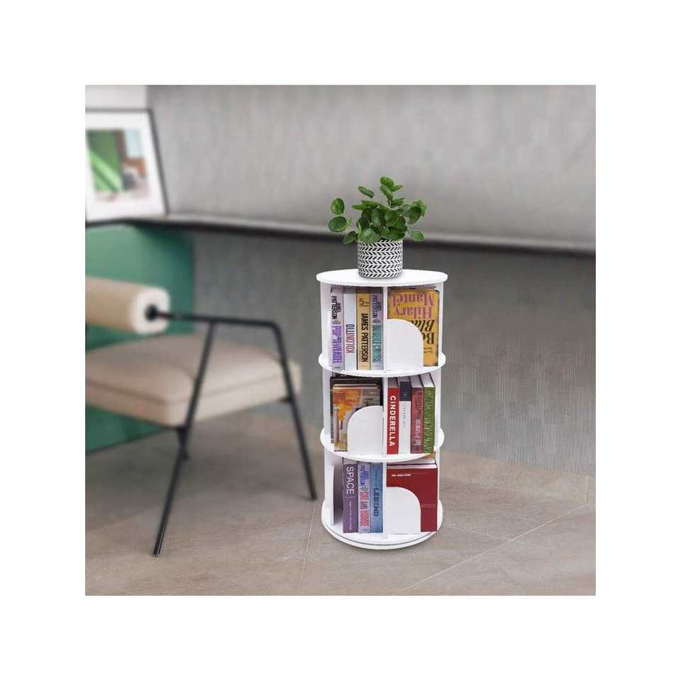 White PVC 3-Tier 360° Rotating Bookshelf Organizer Stackable Desktop Bookcase Counter Bookcase Small Corner Bookshelf for Small