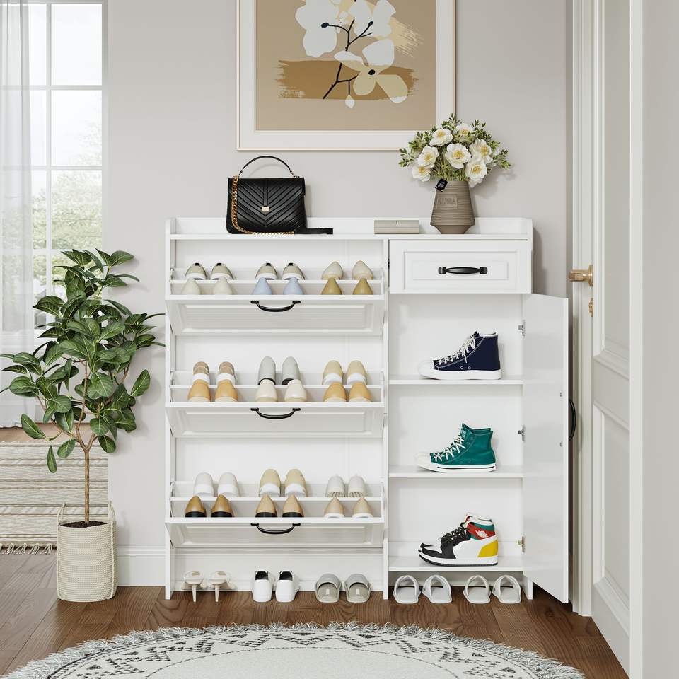 Scarpiera in PVC bianco con 4 ante e 1 cassetto, ampio spazio contenitivo