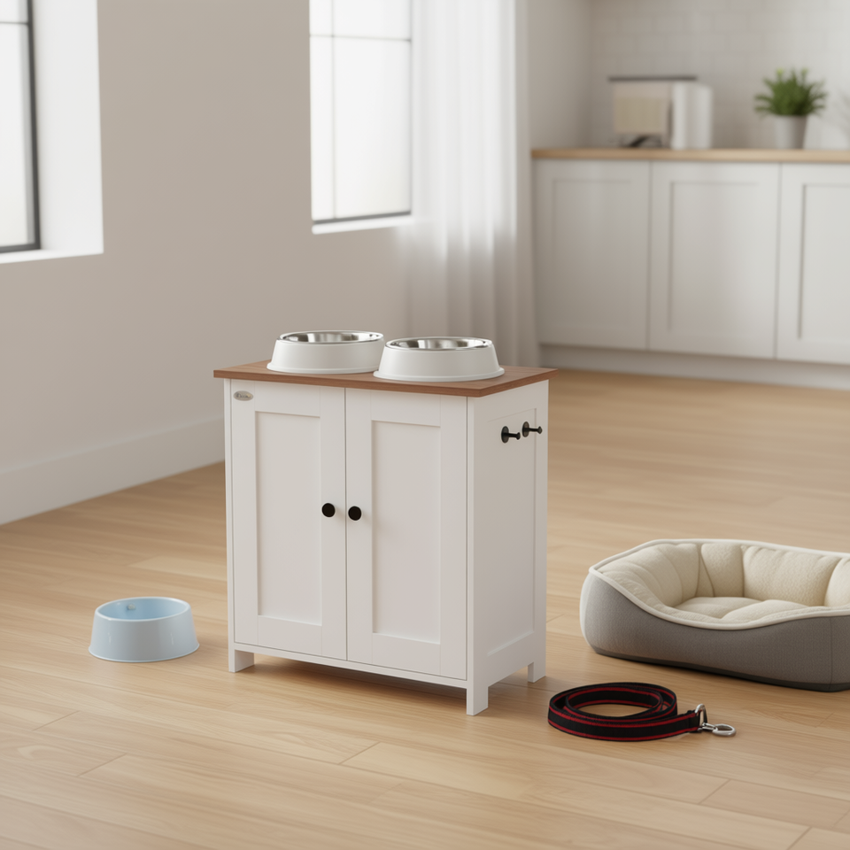 Pet Feeding Station White Wood Raised Adjustable Bowls Storage Panel Hooks Medium Dogs