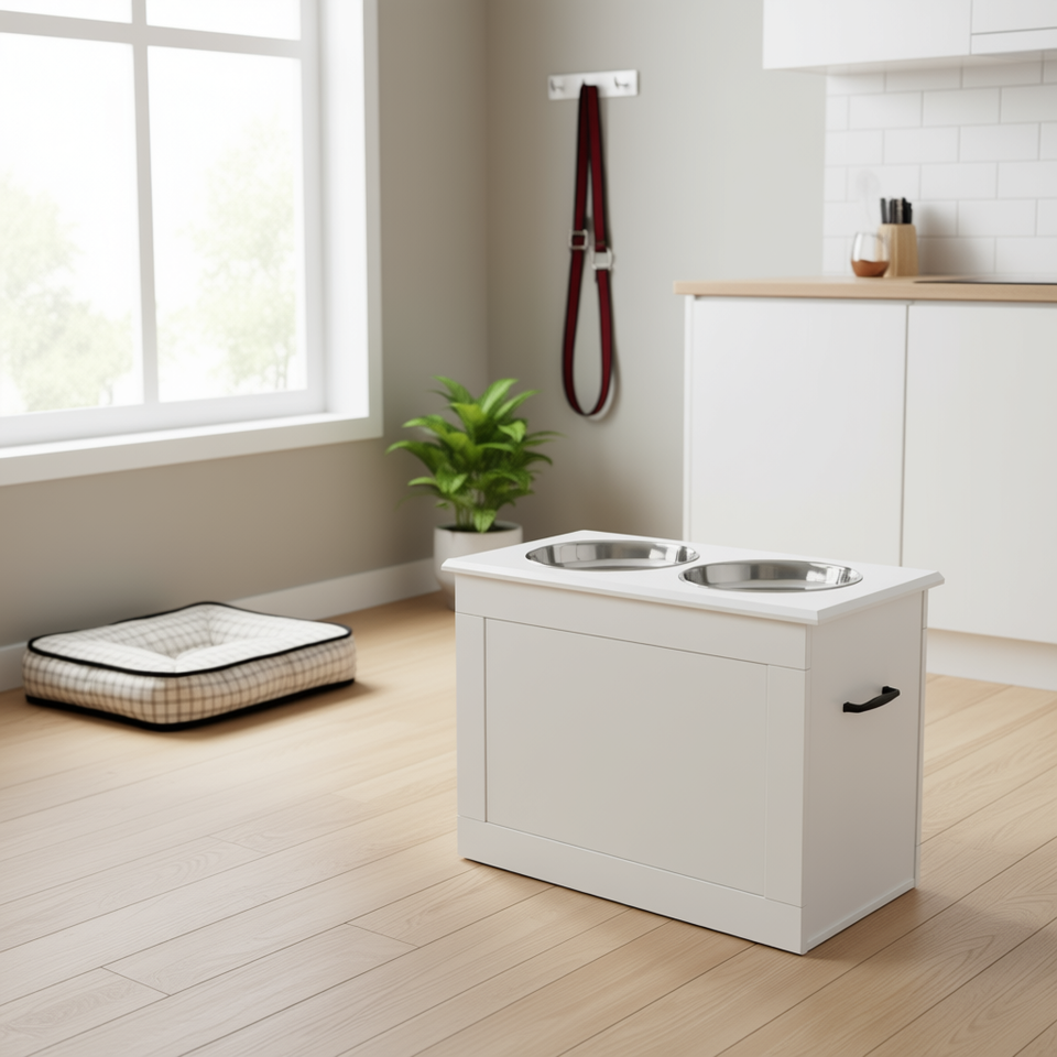 Stazione di Alimentazione per Animali Domestici Bianca con Ciotole in Acciaio per Cani, 2 in 1, per Alimentazione e Conservazione, Uso Interno, Design Moderno