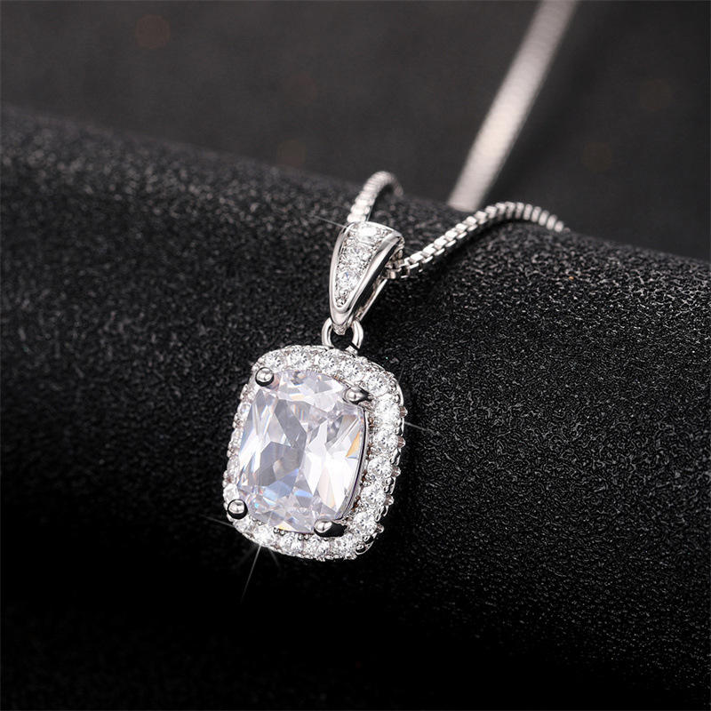 Collana con Pendente in Argento 925 Placcato Rodio Bianco con Strass, Taglio Smeraldo, Montatura a Griffe, Catena Box, Gioielli Classici da Sposa per Donna